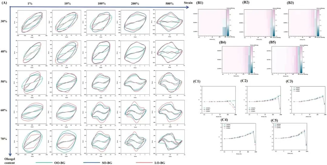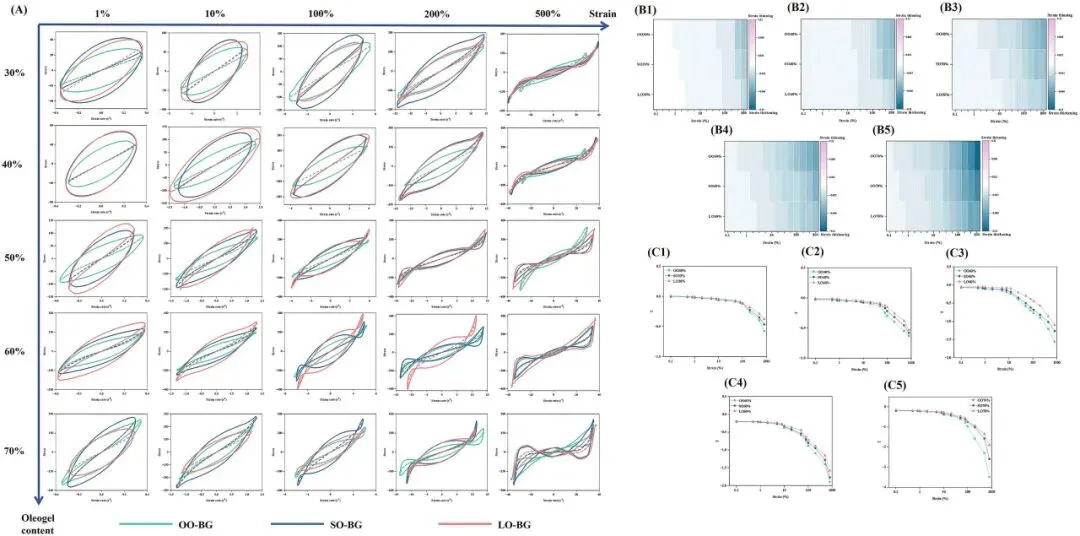 Fig. 5. The strain elastic characteristics of bigels. (A) Elastic LB curve at an oscillation frequency of 1.0 Hz, showing strain amplitudes ranging from 1% to 500%; (B1∼B5) Heat maps of the normalized e3/e1 values, illustrating the different regions of strain stiffening/softening of bigels. (C1∼C5) Stiffening index S values. 1∼5 indicates a gradual increase in oleogel content.