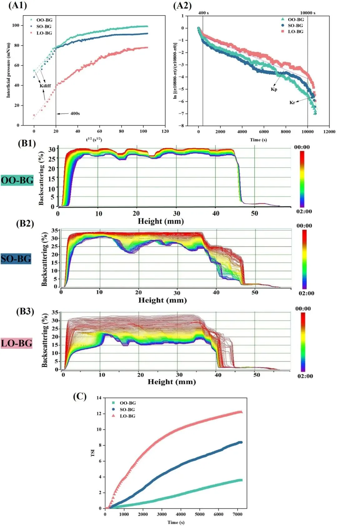Fig. 7. The adsorption dynamics of the gelator at different oil-water interfaces and the multiple light scattering results of different bigel systems: (A1) The π versus root time (t1/2); (A2) The ln [(π10800-πt)/(π10800-π0)] versus time plot. The slopes of Kdiff, Kp and Kr represent the diffusion rate, the penetration, and the structural rearrangement rate, respectively. (B1∼B3) The backscattering light (ΔBS) intensity changes and (C) The Turbiscan Stability Index (TSI) of different bigel systems during 2 h.