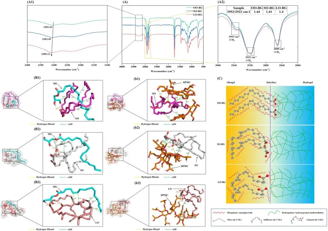 Fig. 8. Schematic diagram of intermolecular interactions in the bigel. (A) FT-IR spectra of three bigel systems; (A1) enlarged view of the peak vibration at 3300 cm−1; (A2) enlarged view of the peak vibration in the range of 2850-2950 cm−1. (B1-B3) Schematic representation of the binding of OO, SO, and LO with MG; (b1-b3) Schematic representation of the binding of OO, SO, and LO with HPMC. (C) Schematic illustrating the interfacial behaviour mechanisms of fatty acids with varying degrees of unsaturation.