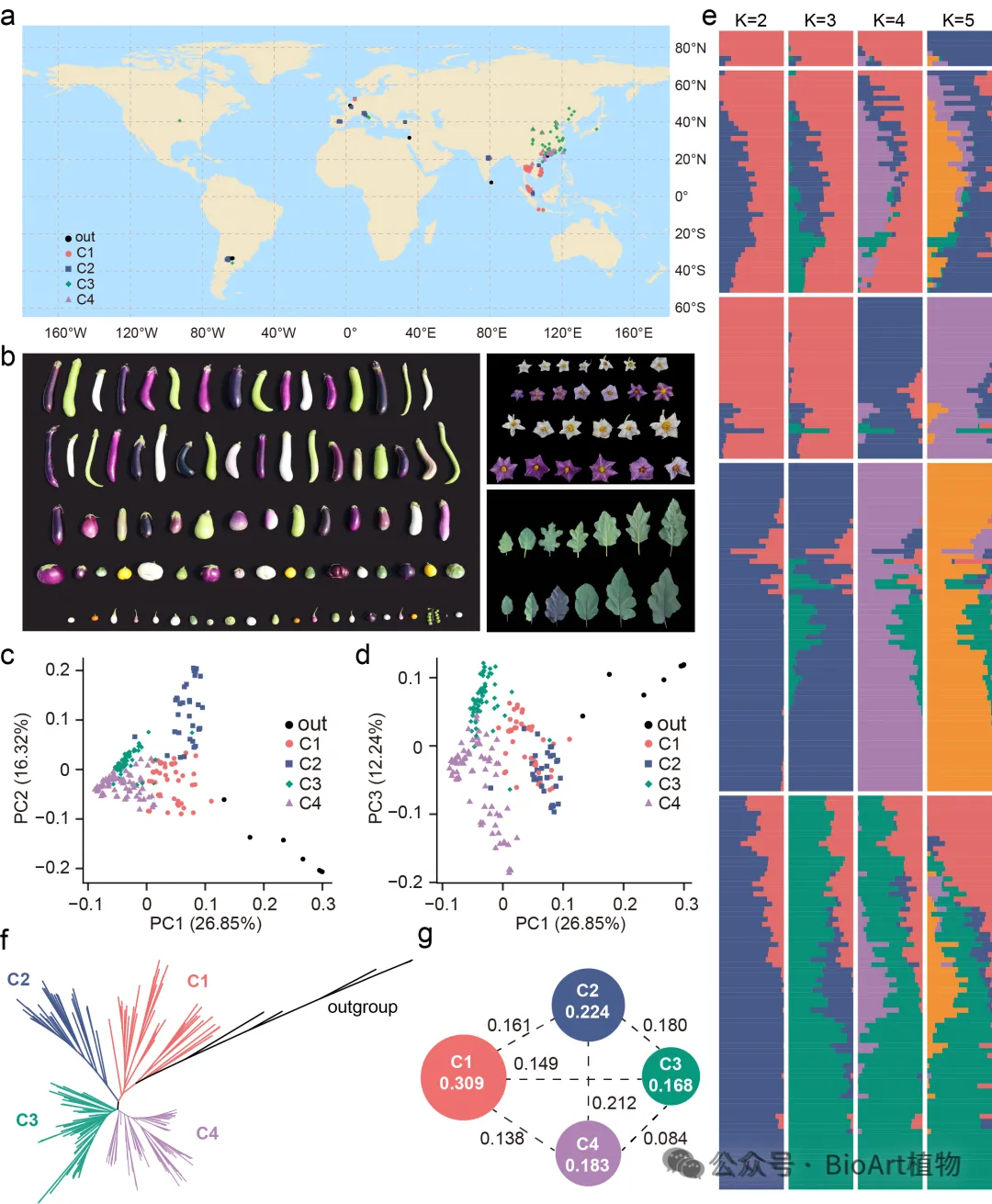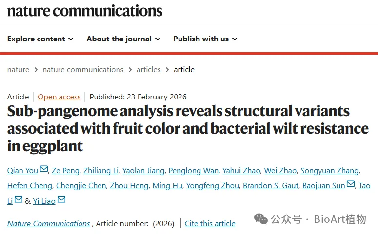 近日,广东省农业科学院蔬菜研究所茄果类资源与育种团队联合华南农业大学园艺学院等单位在Nature Communications上发表了题为Sub-pangenome analysis reveals structural variants associated with fruit color and bacterial wilt resistance in eggplant为的研究论文,系统解析了茄子果色形成和青枯病抗性的关键遗传基础,发现了一个12.4 Mb的染色体倒位与茄子果色性状高度关联,并鉴定出与青枯病抗性相关的关键基因及结构变异,为茄子果色和青枯病抗性分子育种及新种质创制提供了重要理论依据和分子工具。226份茄子种质资源的地理分布与基因组多样性