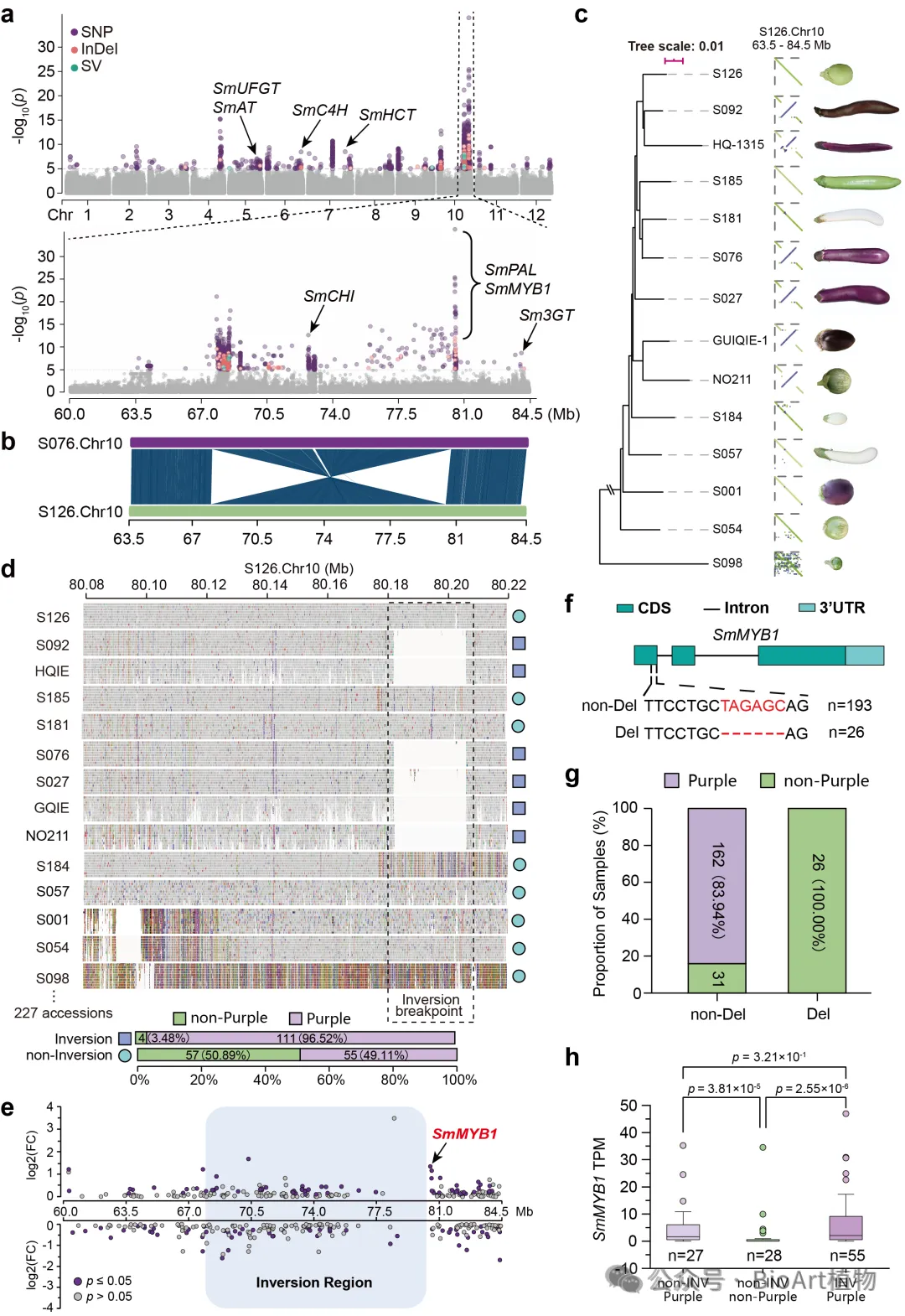 该研究通过GWAS分析全面挖掘了调控茄子果色的重要遗传位点,并首次在茄子的第10号染色体上发现了一个约12.4 Mb的染色体倒位与紫果色表型存在极强关联。这一倒位在本研究茄子群体中频率达到了50.44%,在中国茄子品种中更是高达70.80%。这个倒位是通过与一个已知的调控因子—SmMYB1基因“搭便车”(hitchhiking)的形式被人工选择下来。群体遗传学分析显示,携带该倒位的群体遗传多样性显著降低,且该区域出现了一个巨大的连锁单体型和抑制重组的现象。这表明,这个倒位很可能是茄子在中国被驯化或改良的过程中,因人工选择使紫色性状迅速增加并固定下来,形成了独特的“中国茄子”遗传印记。