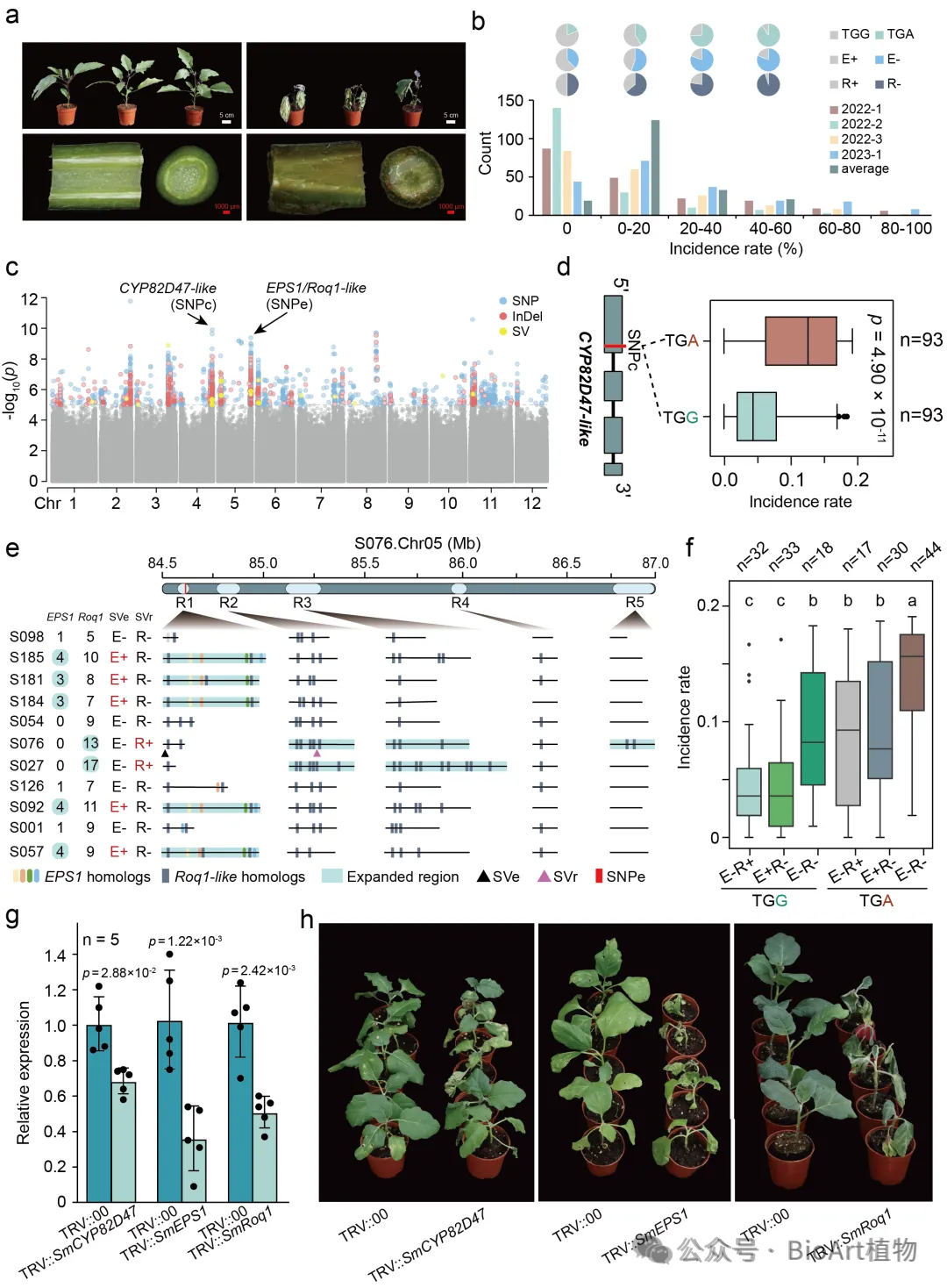 在青枯病抗性研究方面,团队通过多类型变异的GWAS分析,定位到多个稳定的抗性相关位点。研究锁定了三个关键的抗病基因/位点:SmCYP82D47基因中的提前终止密码子突变显著降低抗性水平;同时,SmEPS1和SmRoq1同源基因在不同材料中存在明显的拷贝数变异,并与抗病表型密切相关。这三个基因位点呈现出了清晰的协同作战模式:SmCYP82D47的功能是基础,当其功能完整时,高拷贝数的SmEPS1或SmRoq1能进一步提升抗性;而当SmCYP82D47功能丧失时,即使有高拷贝的辅助基因,植株仍可能易感病。这为通过多基因聚合育种培育高抗品种提供了明确的理论指导。