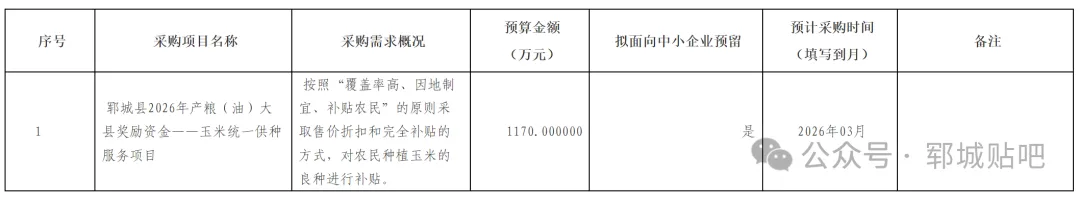为便于供应商及时了解政府采购信息,根据《财政部关于开展政府采购意向公开工作的通知》(财库〔2020〕10号)等有关规定,现将郓城县农业农村局2026年02月(至)03月政府采购意向公开如下: