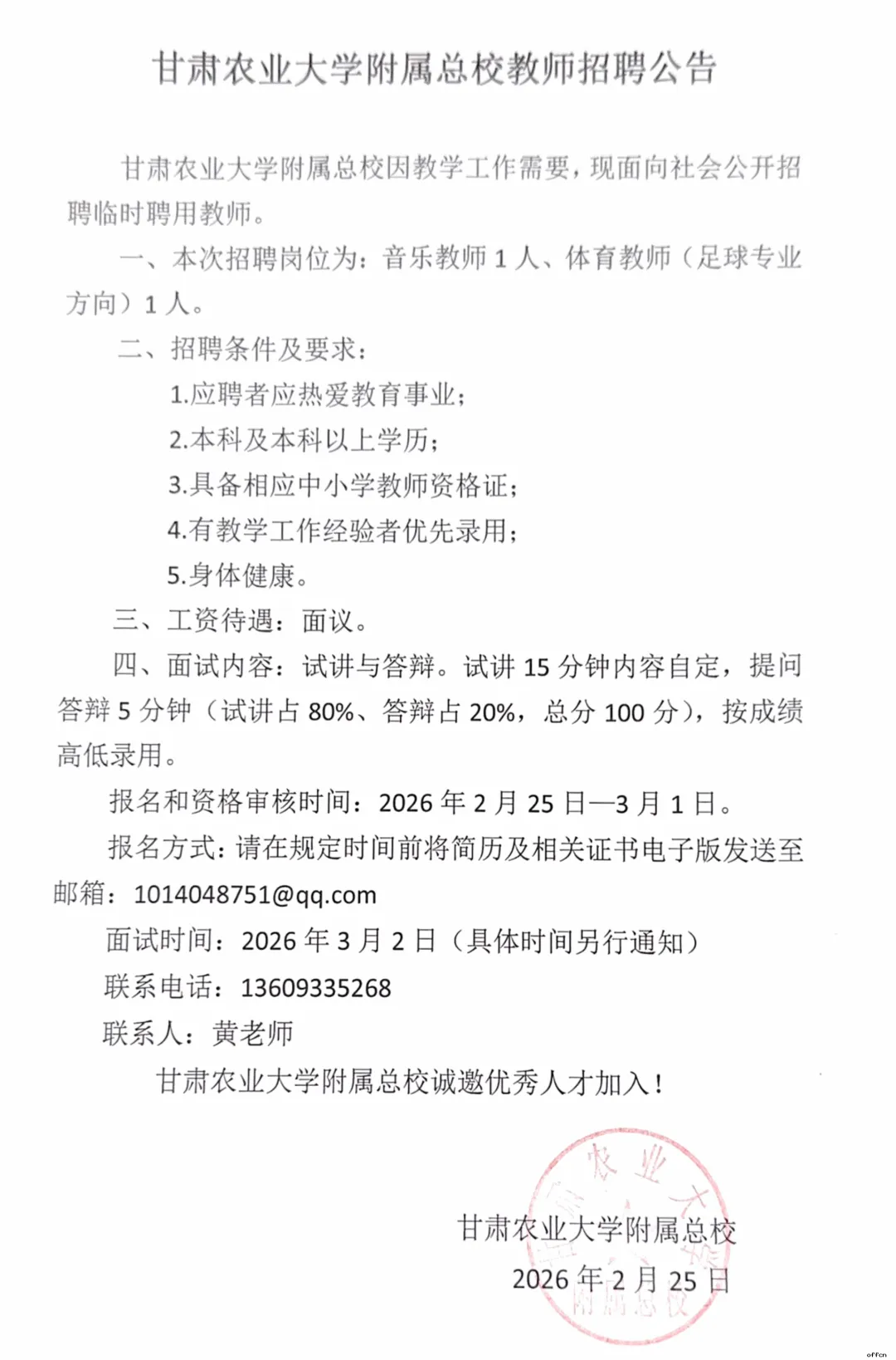 兰州教师招聘,2026年甘肃农业大学附属总校招聘教师公告