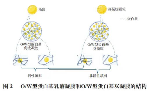 水包油(O/W)型蛋白基乳液凝胶是一种以O/W型蛋白基乳液为基础所形成的凝胶状半固体。其中,蛋白质凝胶网络结构作为连续相,油滴作为分散相进行填充。O/W型蛋白基双凝胶是一种由蛋白基水凝胶和油凝胶混合制备而成的半固体,其中蛋白质凝胶网络结构同样作为连续相,而油凝胶颗粒作为分散相。O/W型蛋白基乳液凝胶和O/W型蛋白基双凝胶均具有与动物脂肪类似的结构和理化性质,能够解决传统脂肪模拟物在应用时出现的多种问题。