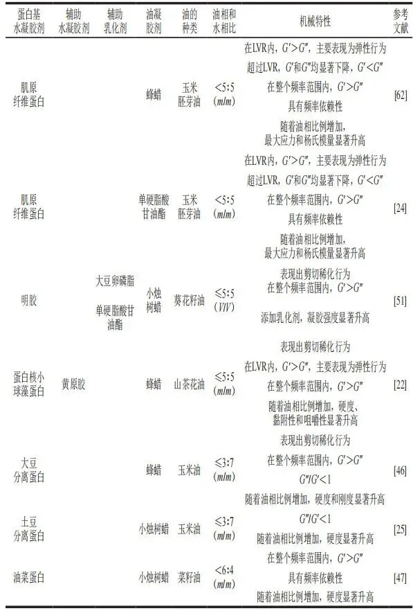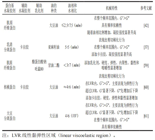 根据测定时凝胶的形变条件,凝胶的机械特性通常需要采用以下两种方法进行测定,即低形变条件下的流变分析法和高形变条件下的质构分析法。其中,流变分析法是采用小应力评估凝胶的黏弹性,如储能模量(G’)和损耗模量(G”),从而深入了解其分子结构和稳定性。然而,质构分析法需要施加较大的力评估凝胶的抗变形能力,从而得到凝胶质构特性的相关信息。当前,已有部分研究通过采用流变分析法和质构分析法探究O/W型蛋白基乳液凝胶和O/W型蛋白基双凝胶的机械特性,如表1、2所示。