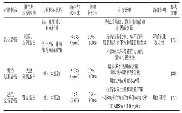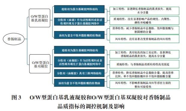 O/W型蛋白基乳液凝胶和O/W型蛋白基双凝胶在模拟香肠制品动物脂肪方面的应用见表3、4。二者对香肠制品各种品质指标的调控机制及影响如图3所示。这两种凝胶均为柔软的含油半固体材料,能够较好地模拟香肠制品中的动物脂肪,从而最大程度保留香肠制品原有的风味和质地,且二者在应用中展现出多方面的共性特征。从风味特性来看,当采用O/W型蛋白基乳液凝胶替代乳化香肠中的动物脂肪时,其风味与减脂样品高度接近。Siachou等也证实了当O/W型蛋白基双凝胶被应用于发酵香肠时同样不能显著改变其风味特性。这一相似性特征产生的原因可能是两者均能通过凝胶基质对植物油的异味成分进行有效封装。就色泽而言,两种凝胶的作用效果也同样具有相似性。Zhao Shengming等采用乳液凝胶替代博洛尼亚香肠中的动物脂肪,发现替代后产品的亮度L*值提升,但红度a*值却下降。Kibler等研究发现,添加米糠蜡-明胶双凝胶的烟熏香肠也呈现L*值升高及a*值下降的趋势,说明两种凝胶的凝胶体系对色泽的影响相近。另外,两种体系在营养改进方面也具有相似性,其中O/W型蛋白基乳液凝胶能够减少总脂肪、饱和脂肪酸与胆固醇的含量,而O/W型蛋白基双凝胶也同样能够实现能量、脂肪、饱和脂肪酸及胆固醇的多维度优化。在脂肪氧化方面,已有研究表明,将O/W型蛋白基乳液凝胶应用于法兰克福香肠的脂肪替代时,其硫代巴比妥酸反应物(TBARS)值低于 1.0 mg/kg,即达到食品的酸败极限。Kibler等对米糠蜡-明胶双凝胶替代烟熏香肠动物脂肪时脂质氧化情况进行分析,结果表明所有处理组的脂质氧化水平同样很低,并也出现TBARS值小于酸败极限值的现象。在加工特性方面,Zampouni等发现O/W型蛋白基双凝胶替代半干香肠中动物脂肪可显著降低其蒸煮损失,这与O/W型蛋白基乳液凝胶替代法兰克福香肠中动物脂肪的研究结果相吻合,其共性机制可能在于凝胶网络致密结构对水分和油脂的物理截留作用。需要指出的是,这些相似性和差异性并不是绝对的,可能会受原料特性与工艺参数等条件的变化而变化,例如具有较高双凝胶脂肪替代率的低脂汉堡,由于含有较高含量的不饱和脂肪酸,加热后会导致风味的降低,这与上述无异味的结论形成矛盾,表明脂肪替代比例等工艺参数对产品的最终品质具有关键影响。