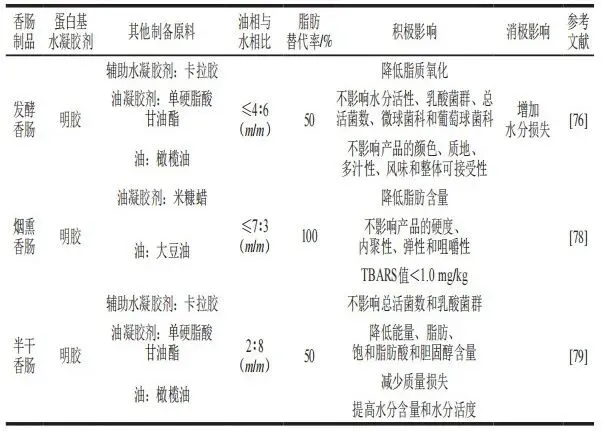 在香肠制品的加工过程中,通常需要添加动物脂肪才能形成香肠制品优良的质地和风味。然而,已有大量研究表明香肠制品中脂肪添加量的降低往往会对其保水性、质地及风味等品质特性造成不利影响。O/W型蛋白基乳液凝胶和O/W型蛋白基双凝胶因具有与动物脂肪类似的结构特征而受到广泛关注。Choi等研究了油的种类和浓度对O/W型大豆分离蛋白乳液凝胶的影响,并将该乳液凝胶与动物脂肪组织进行比较。Zhou Mengjing等利用明胶、米糠蜡和蜂蜡制备O/W型蛋白基双凝胶,并探究了水凝胶与油凝胶的比例对双凝胶流变性等机械特性的影响,从而探讨O/W型蛋白基双凝胶在脂肪替代中的可能性。Gao Yanlei等采用两步冷固化法制备蜂蜡-明胶双凝胶,并将其用于替代鱼丸中的脂肪。由此可见,O/W型蛋白基乳液凝胶和O/W型蛋白基双凝胶在替代动物脂肪方面具有巨大潜力。