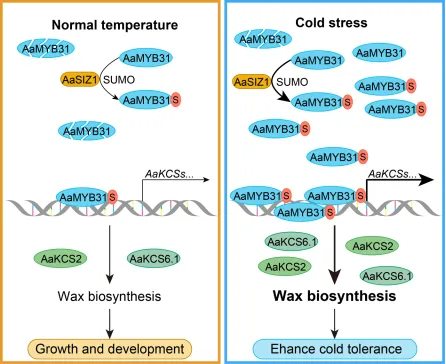 综上,该研究阐述了软枣猕猴桃抗寒的一条重要调控机制——AaSIZ1-AaMYB31s-AaKCSs调控模块。AaSIZ1增强了冷胁迫下AaMYB31s的蛋白稳定性,其能够大量激活下游AaKCSs基因以提升软枣猕猴桃的蜡质合成,最终增强了软枣猕猴桃的抗寒性。
