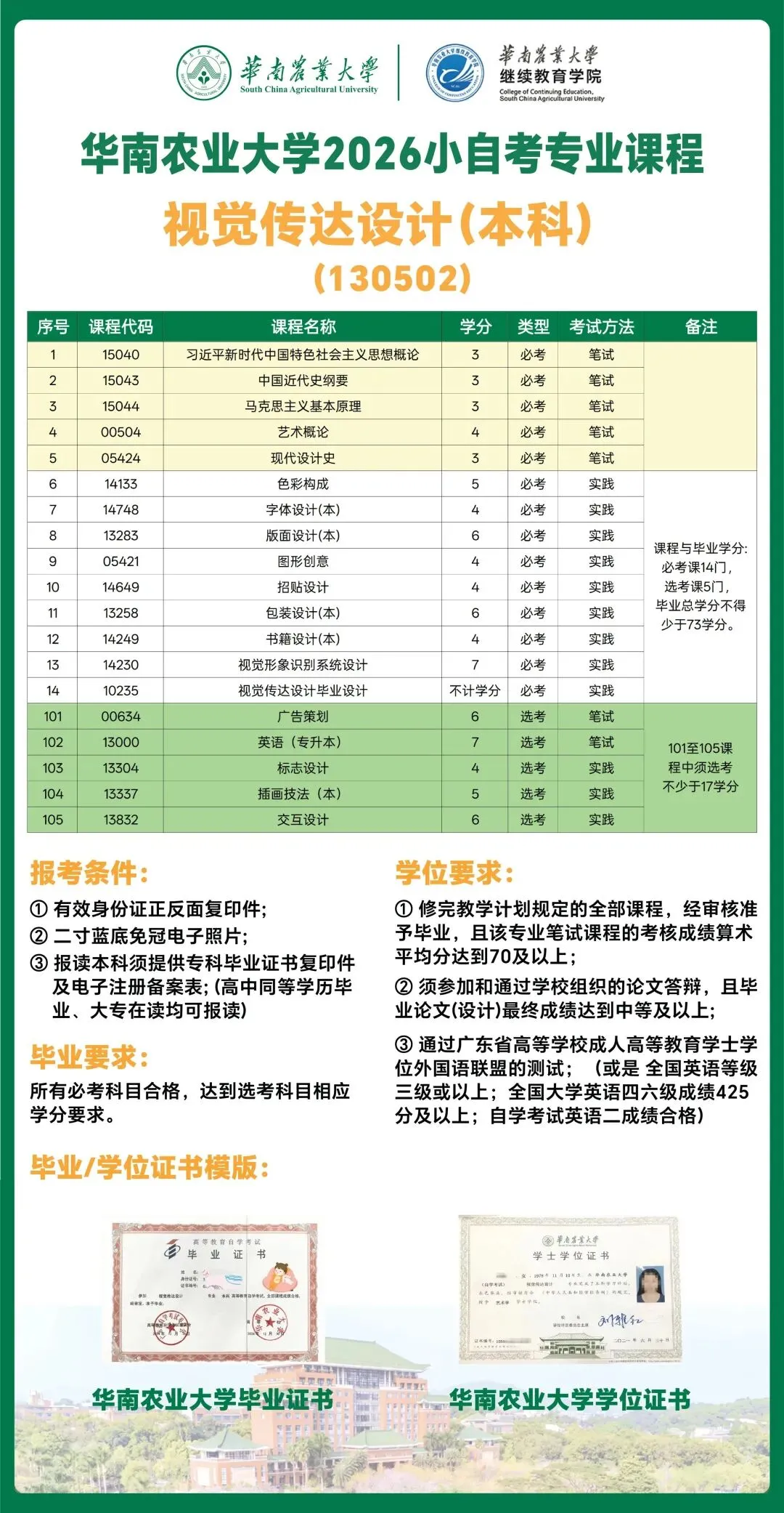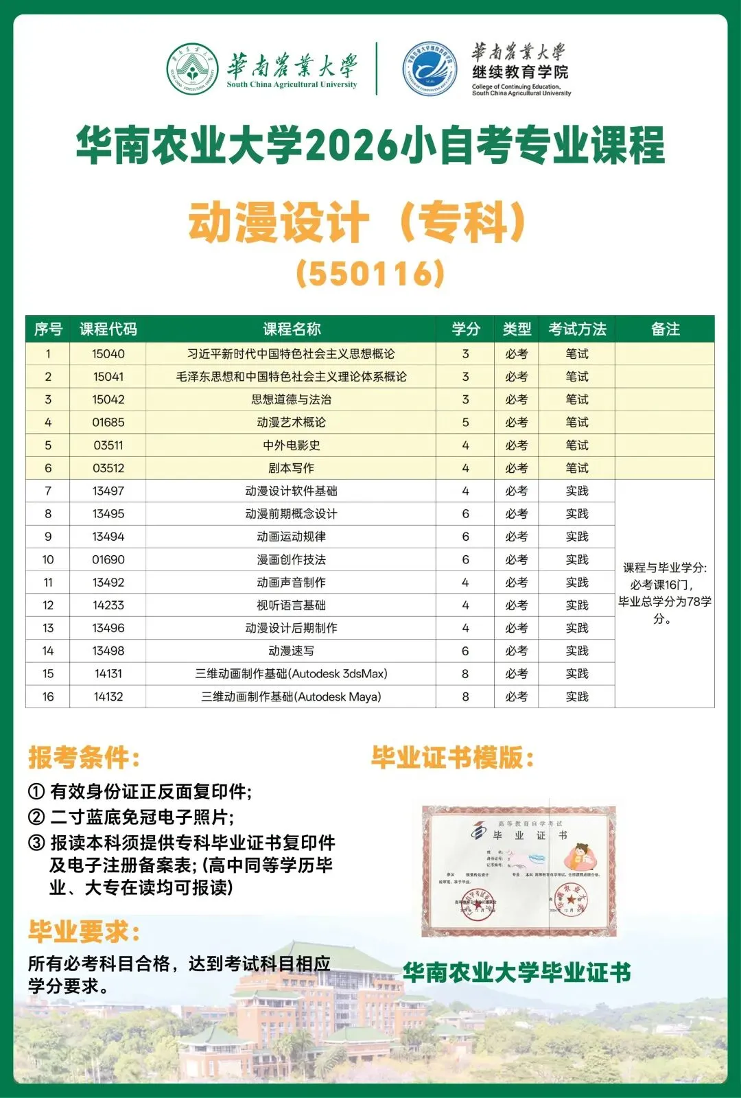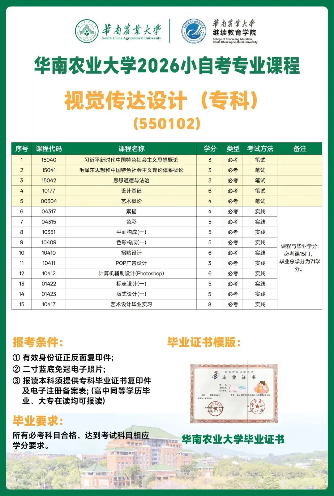📍报读优势:报读核心优势:依据 2026 年该专业全新培养计划,统考仅考核 5 门笔试科目,含 3 门思政课(思想道德、毛泽东思想、新时代思想)与 2 门专业课(艺术概论、设计基础);剩余 10 门均为院校实践考核,考核形式丰富多元。相较大自考,该专业考核难度更低、毕业周期更短,1.5 年完成全部科目考核即可申请毕业,且报考无前置学历限制。