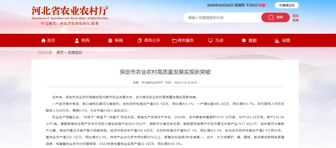 农业生产根基扎实,“米袋子”“菜篮子”“肉盘子”供应充足。粮食生产实现丰产丰收,2025年,全市粮食种植面积1015.16万亩,总产423.26万吨,单产416.94公斤/亩。望都县南张庄高产攻关示范田小麦实收亩产达869.93公斤,刷新河北省历史纪录;曲阳县百亩高产示范方夏玉米亩产达1017.48公斤,创年度河北省单产之最,保定市夏玉米亩产首次突破吨级。经济作物全年产值393.6亿元,占农林牧渔总产值的47.1%,同比增长5.4%,拉动全市农林牧渔总产值2.5个百分点。畜牧业总产值252.7亿元,同比增长3.4%,肉羊产业占北京市场份额30%以上,家禽出栏连续3年全省第一。此外,大力培育驴、鹿、硒鸽、鸵鸟等优势特色养殖品类,构建畜牧业多元化发展格局,2025年其他畜牧业实现产值22.2亿元,同比增长30.3%。