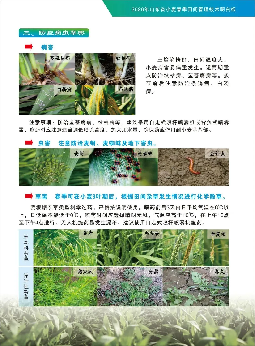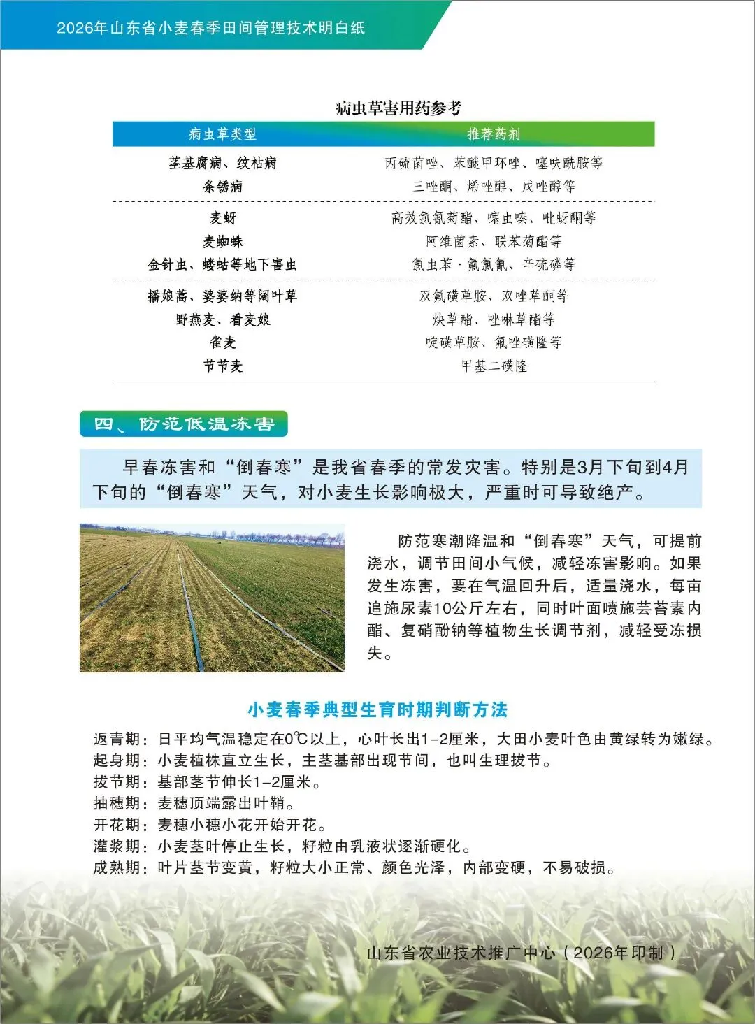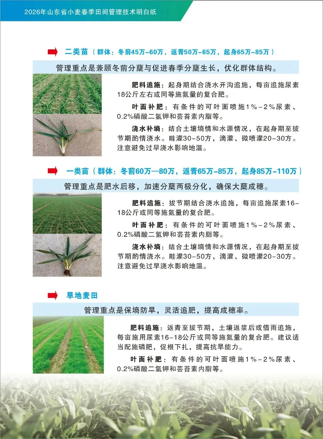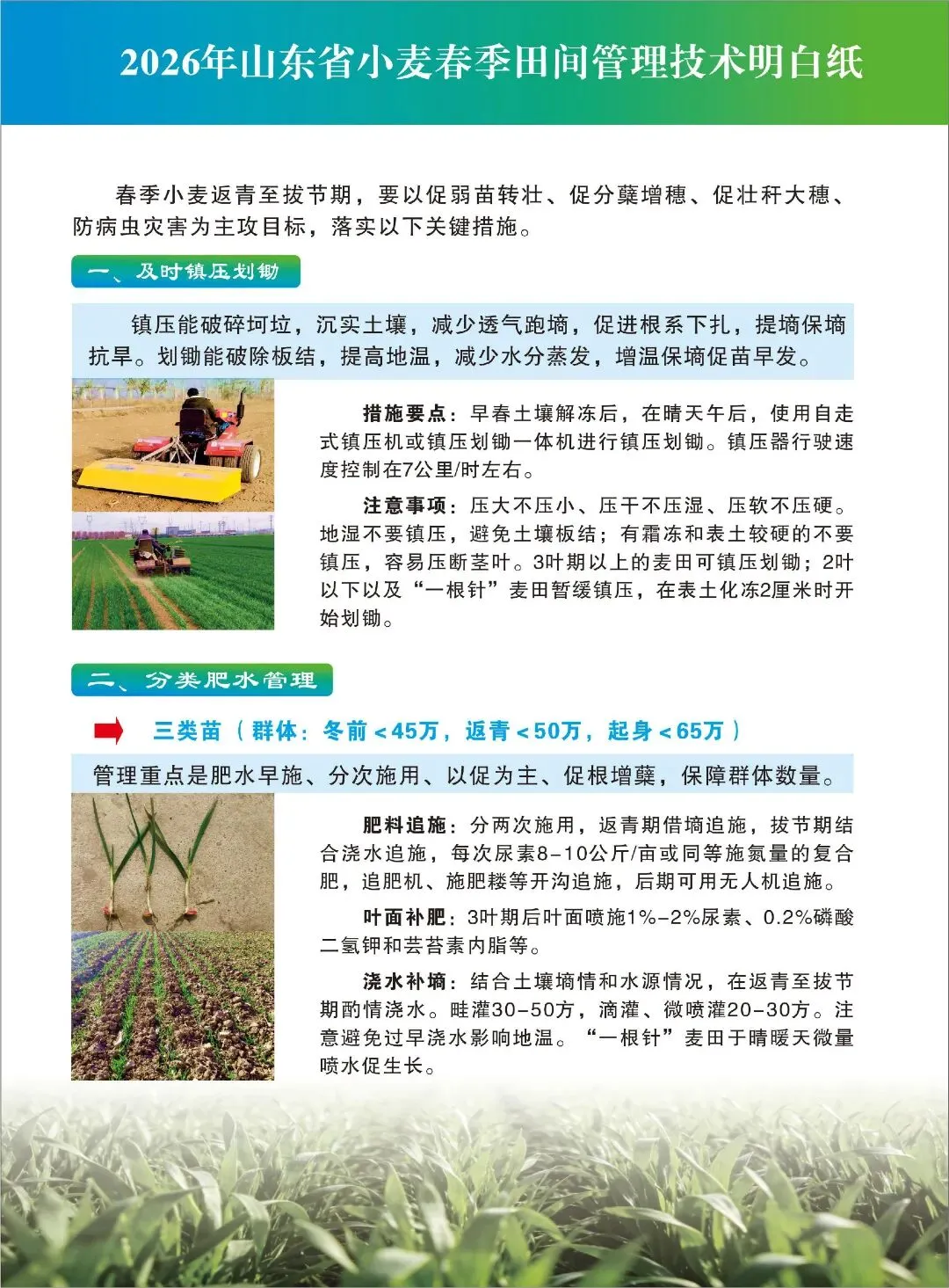 春回大地,万物复苏。当前正是抓好小麦春季田间管理、促进苗情转化的黄金窗口期!管理措施跟得上,夏粮丰收有保障。为了帮助大家解决“今年小麦怎么管”的难题,省农业技术推广中心专门制作了这份《2026年山东省小麦春季田间管理技术明白纸》,图文并茂,一看就懂。建议大家收藏好,下地前翻一翻,心里更有底!