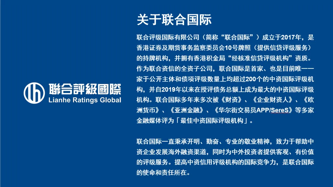 联合国际是联合资信评估股份有限公司的子公司。联合国际评审委员会拥有对公司独立评级和研究中使用的任何方法或流程的最终解释权。