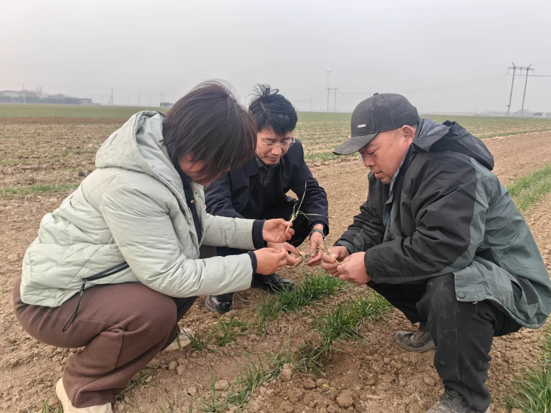 在许昌市建安区和襄城县,服务团专家针对2025年小麦秋播偏晚、弱苗比例较高、2026年春季气温波动大、病虫害与倒春寒风险并存的实际情况,深入田间地头现场研判苗情、根系发育状况及土壤墒情,科学制定差异化管理方案。对于晚播弱苗地块,提出可在返青期至起身期、拔节后期至孕穗期分两次水肥管理,每次每亩追施尿7~8kg,助力苗情稳定升级。对于病虫害防治,现场指导农户精准识别根腐病、茎基腐病等病害早期症状,提醒农户抢抓晴好天气开展病虫草害综合防治;同时密切关注气象预报,以镇压保墒、灌水调温等措施有效防范倒春寒等不利天气的影响。