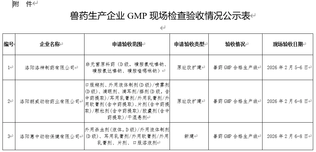 根据《兽药生产质量管理规范》(2020年修订)、《兽药生产质量管理规范检查验收办法》相关规定,河南省农业农村厅派出专家组对洛阳洛神制药有限公司、洛阳朗威动物药业有限公司、洛阳惠中动物保健有限公司实施兽药GMP的情况进行现场检查验收。现将验收结果予以公示,公示时间为2026年2月26日至3月4日。如有意见和建议,请在公示期内反馈至河南省农业农村厅法规处(行政审批服务办公室)。