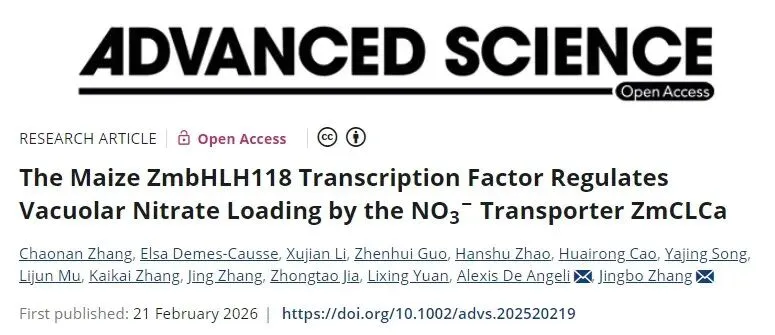 近日,中国农业大学资源与环境学院/养分资源高效利用全国重点实验室张敬波教授课题组联合法国蒙彼利埃植物科学研究所Alexis De Angeli教授团队在国际权威期刊《先进科学》(Advanced Science)上发表了题为《玉米转录因子ZmbHLH118通过液泡膜硝酸盐转运蛋白ZmCLCa调节液泡硝酸盐装载》(The maize ZmbHLH118 transcription factor regulates vacuolar nitrate loading by the NO3- transporter ZmCLCa)的研究论文,揭示了ZmbHLH118-ZmCLCa组件通过介导液泡硝酸盐转运调节玉米氮利用的生物学功能及分子调控机制,首次报道了CLCa介导的液泡硝酸盐转运的上游转录调控机制,弥补了该领域二十多年的研究空白,并为玉米氮高效利用的遗传育种工作提供了重要的靶点及理论基础。