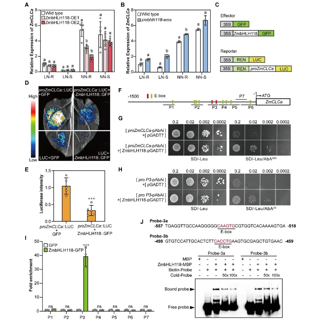 图2 ZmbHLH118直接结合ZmCLCa的启动子并抑制其表达