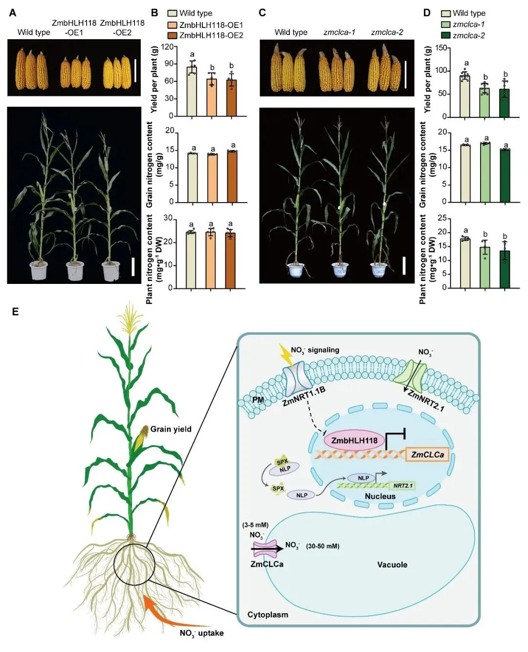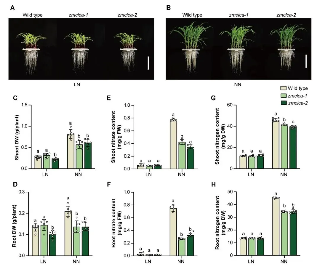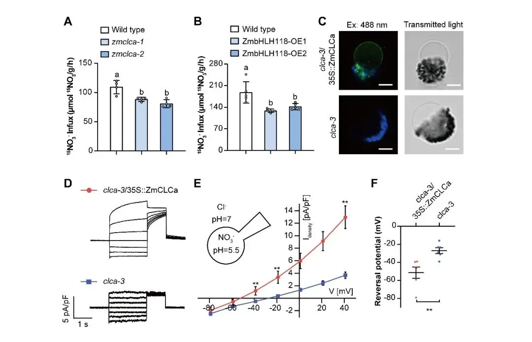 ZmCLCa定位在液泡膜,苗期同样在玉米根系中高表达。其功能缺失突变体zmclca与ZmbHLH118超表达株系表型相似,在氮充足条件下,zmclca具有显著降低的植株生物量及硝酸盐/总氮浓度,且根系表现出比地上部更为显著的氮表型差异。