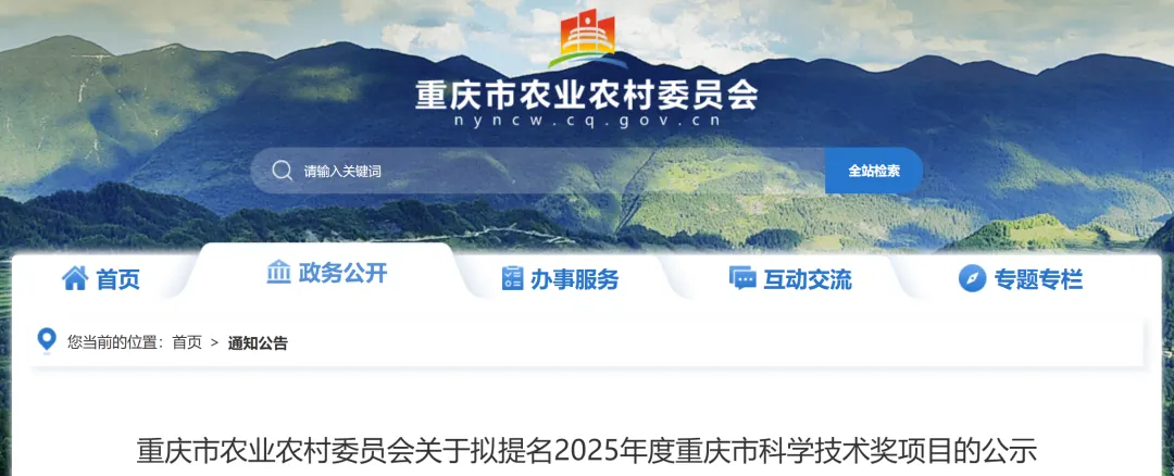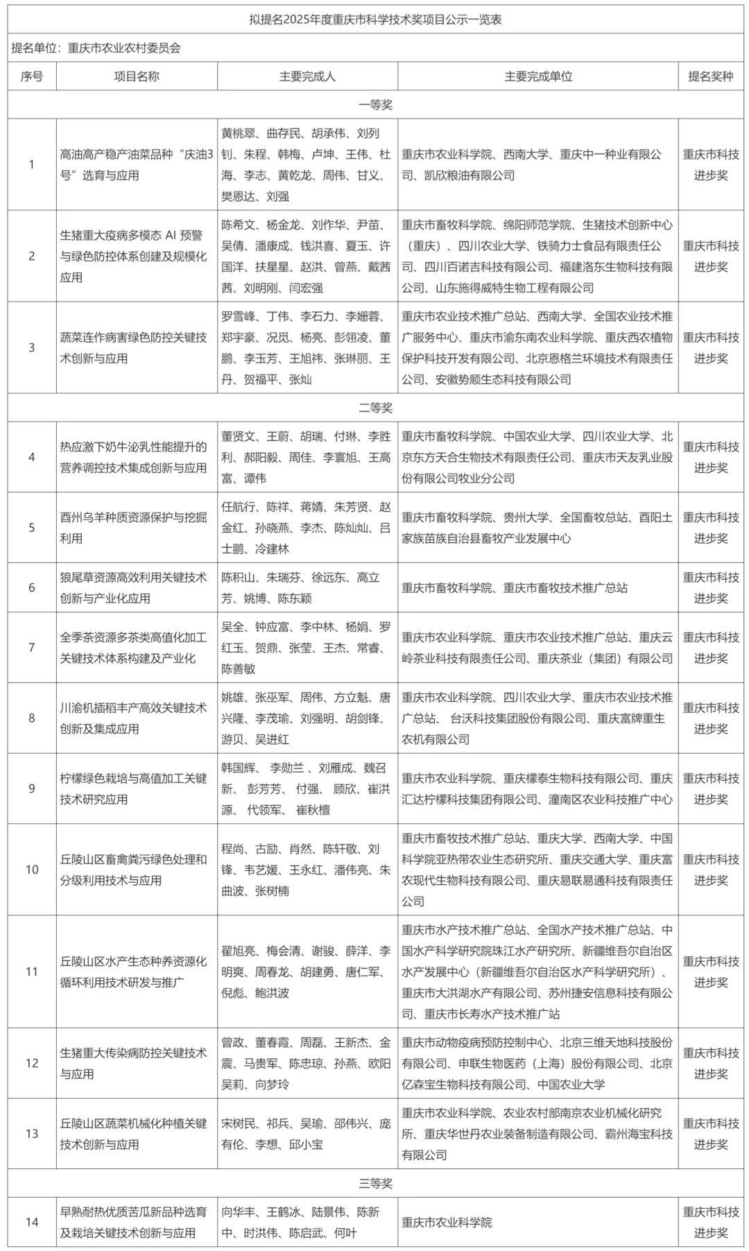根据《重庆市科学技术奖励办法》和重庆市科学技术奖励工作办公室《关于开展2025年度重庆市科学技术奖提名工作的通知》要求,经重庆市农业农村委审核通过,现就拟提名2025年度重庆市科学技术奖予以公示(名单附后),公示期为5天(2026年2月26日至3月2日)。任何单位或者个人对公示内容有异议的,请在公示期内书面向重庆市农业农村委员会反映,并提供必要的证明资料。为便于核实、查证,确保实事求是、客观公正地处理异议,提出异议的单位或者个人应当表明真实身份,并提供联系方式。个人提出异议的,要在书面异议材料上签署真实姓名,单位名义提出异议的,要加盖本单位公章。