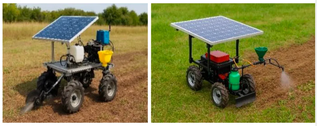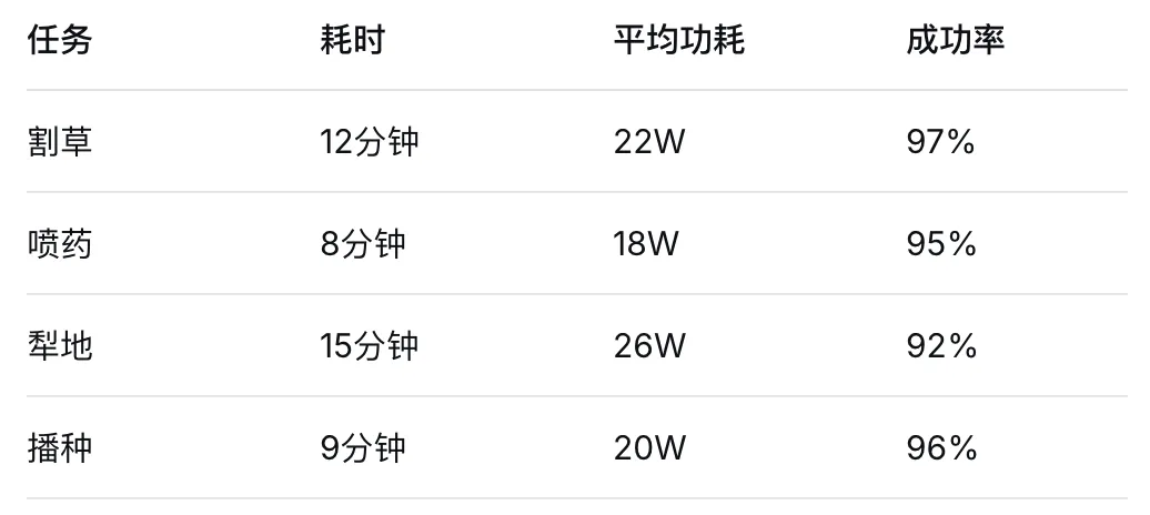所有任务成功率都在90%以上。最耗电的是犁地,平均26瓦;最省的是喷药,只有18瓦。电池是12V 8Ah的锂电池组,轻载能撑3个半小时,满负荷也能干1.3小时。用家用适配器充满要2.5小时,太阳能板可以边干活边补电。