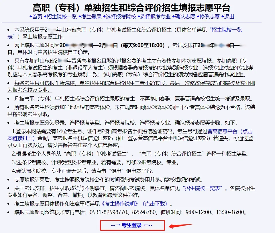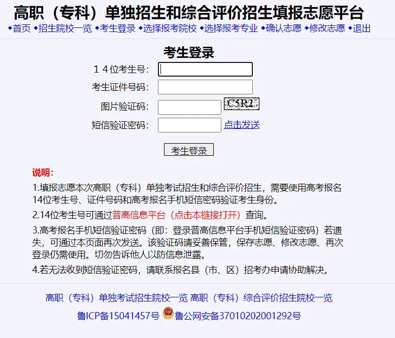 打开省教育招生考试院高职单招报名平台http://wsbm.sdzk.cn/gzdz/,进入高职(专科)单独招生和综合评价招生填报志愿平台首页: