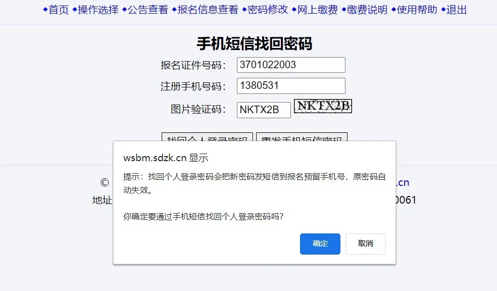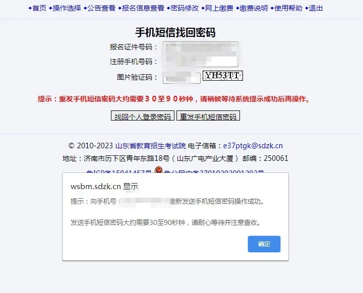 填写报名证件号码、注册手机号码、图片验证码,点击确定按钮。如下图: