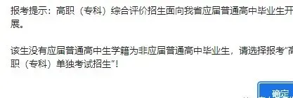 若考生为非应届普通高中毕业生,点击“高职(专科) 综合评价招生”,系统将提示不允许报考:高职(专科) 综合评价招生面向我省应届普通高中毕业生开展。该生没有应届普通高中生学籍为非应届普通高中毕业生,请选择报考“高职(专科) 单独考试招生”!如下图: