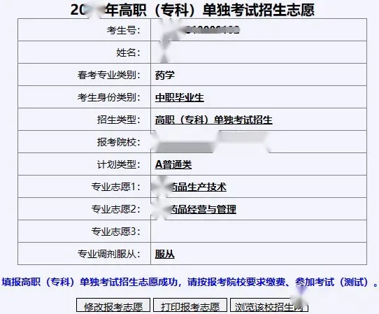 这里也特别提示考生:填报高职(专科) 单独考试招生(或综合评价招生) 志愿成功,请按报考院校要求缴费、参加考试(测试) 。还可点击“浏览该校招生网”打开院校招生网,了解招生、考试相关安排。