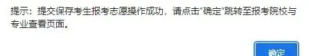 在报考专业选择页面,系统提示保存志愿成功后点击“确定”进入报考志愿 查看及确认页面,如下图: