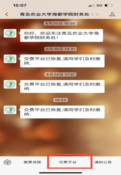 1.关注“青岛农业大学海都学院财务处”服务号进入交费平台,交费平台每天开放时间为03:00—22:00。(注意:缴费结束后点击刷新缴费,避免数据未更新重复缴费)