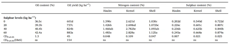 表1 硫肥施用对花生品质参数、籽粒含氮量、含硫量及仁壳比的影响(Gautam et al., 2025)