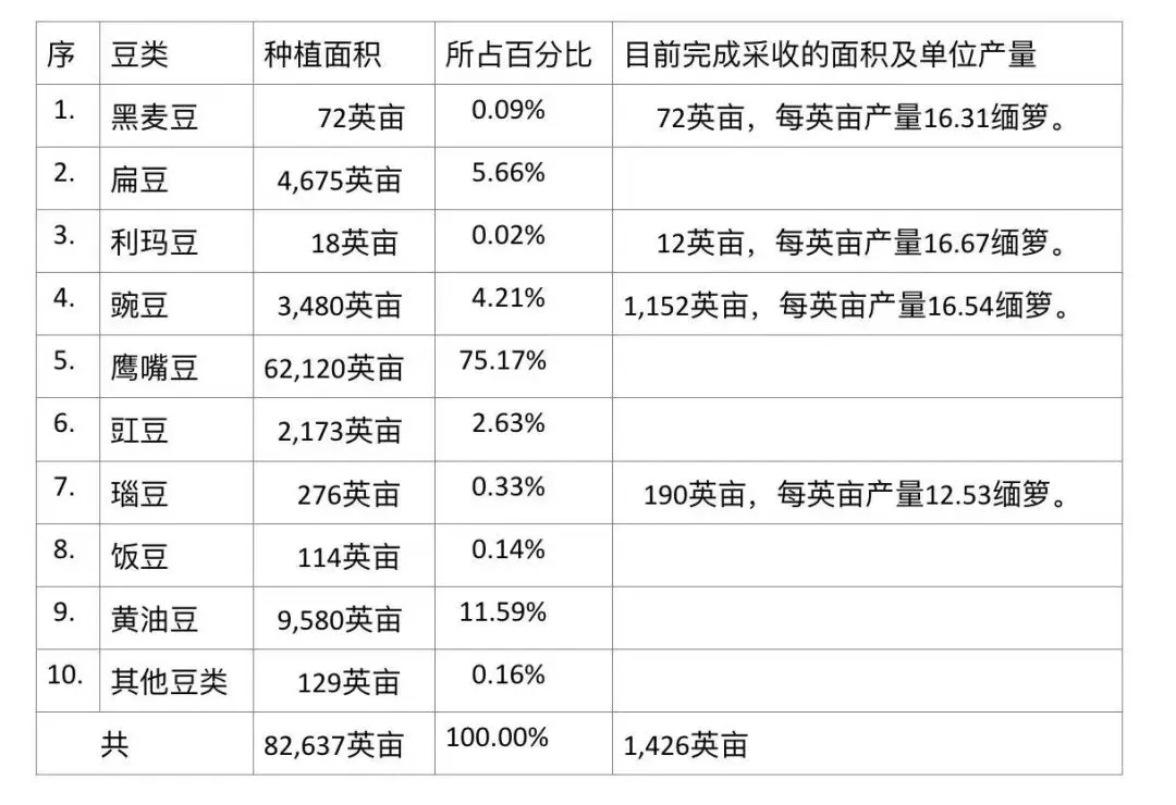 本漂县区现财年冬季种植的各种豆类的种植面积及目前完成采收的种植面积如下表: