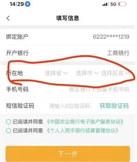 里面的地址:绑定其他银行的四大行卡,地址那个地方(如截图红色圈着的地方),直接选择我发给你的网点的开户信息,所在地,xx省xx市xx县(或者xx区)