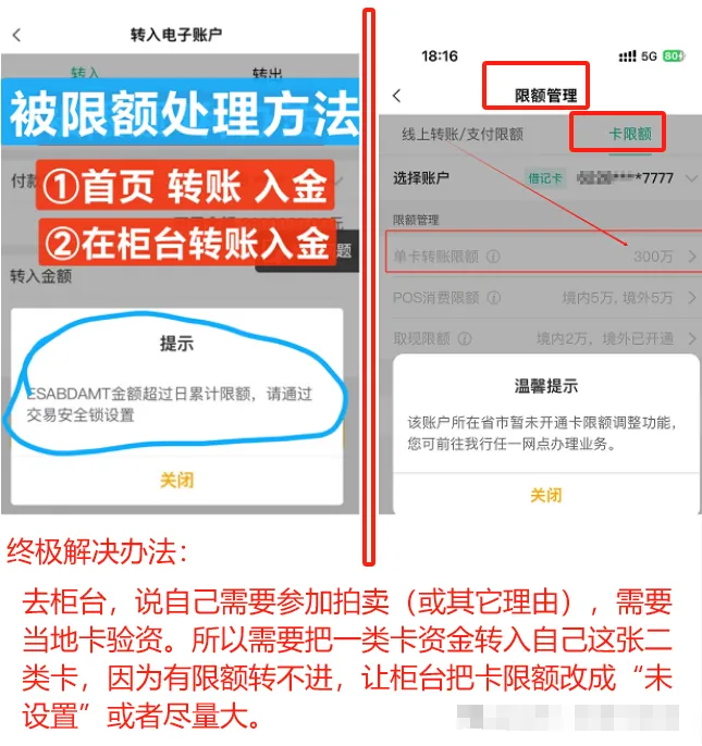 提示:如果农行被限额转入二类账户,可以通过下图方法转入开出来的二类账户,或者直接通过柜台转账和设置转账限额。