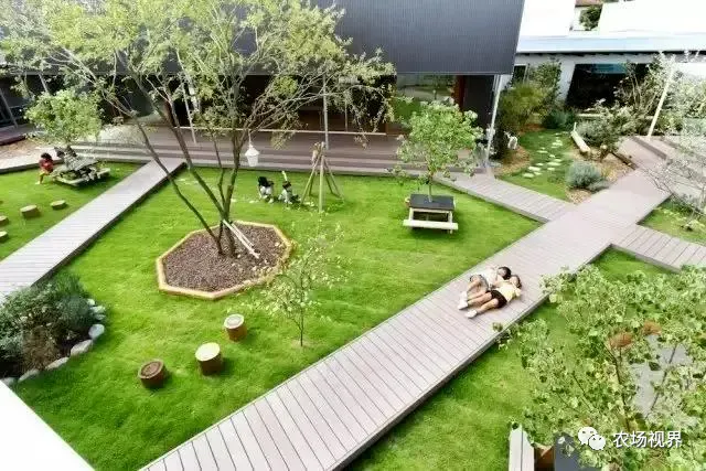 整个农场幼儿园呈"回"字形布局,中央为种满绿植的庭院,走道向四面八方展开,孩子们在这里可以观测植物、嬉戏休息,与大自然亲密接触。