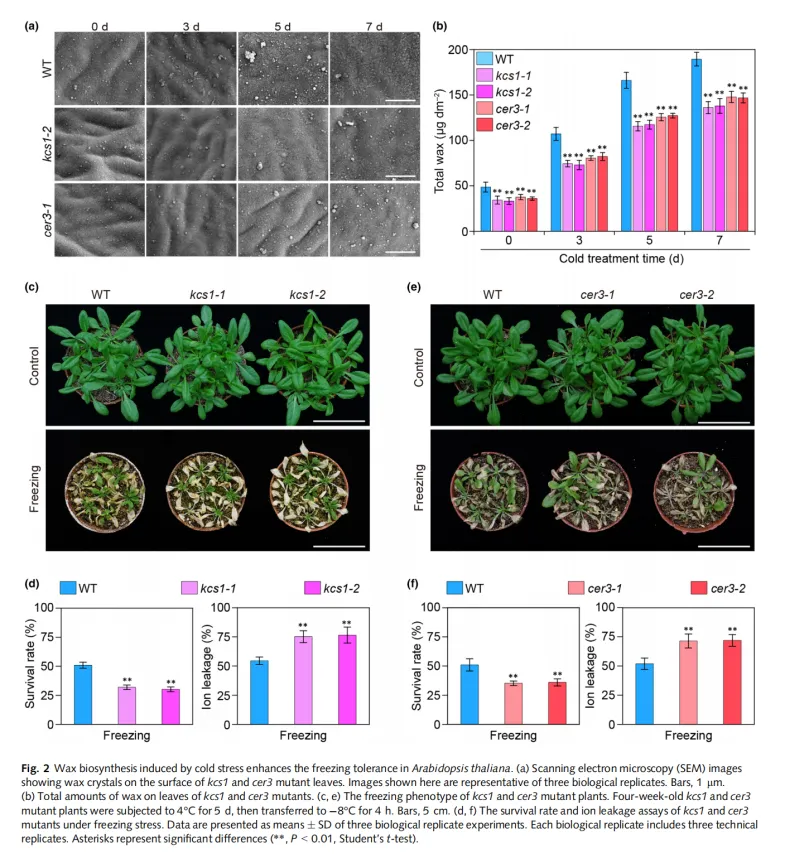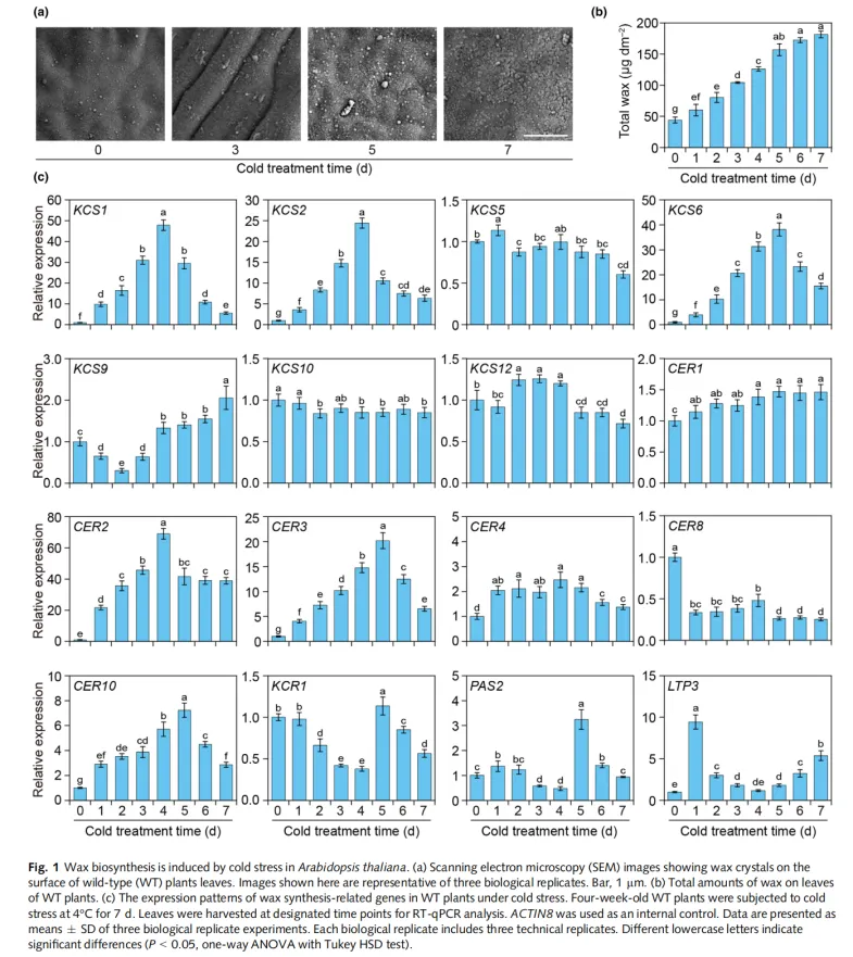 既往研究发现蜡质可增强植物的冷胁迫耐受性,但植物蜡质合成如何响应冷胁迫的调控机制仍不甚明确。本研究揭示,拟南芥的蜡质生物合成受冷胁迫诱导,这是由于冷胁迫下蜡合成基因β-ketoacyl-CoA synthases (KCSs)和ECERIFERUMs (CERs)的显著上调。