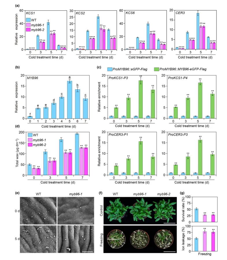 证据表明,MYB96在冷胁迫下表达上调,且MYB96通过激活KCSs和CER3基因促进蜡质合成,从而增强植物的耐寒性。