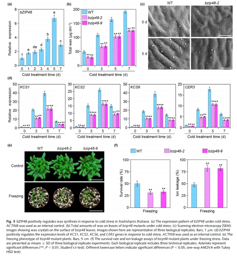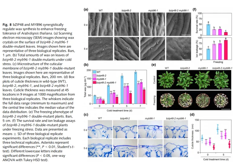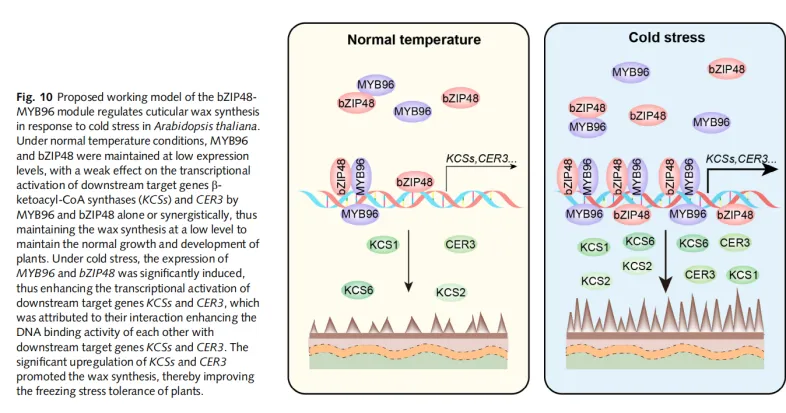 小结:bZIP48-MYB96模块通过直接激活KCSs和CER3基因,响应冷胁迫而正向调控蜡质合成。