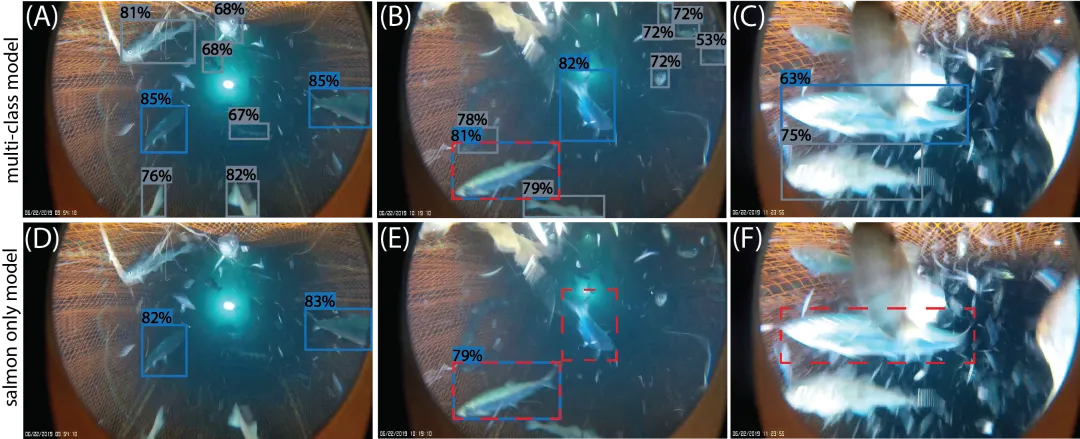 这些技术使科学家能够勘测以前难以进入的区域,同时提高采样频率和数据精度。与基因组学和人工智能等快速发展的领域相结合,可以加快数据处理速度,并为渔业管理者提供更及时的建议。5台摄像机拍摄的视频拼接在一起,形成360度全景画面,也称为马赛克图像。图片来源:美国国家海洋和大气管理局渔业局在 美洲湾 ,先进的视频系统、声学摄像机、回声测深仪和人工智能正在助力开展新一代 红鲷鱼 和珊瑚礁鱼类物种调查。这些努力旨在实现物种自动识别——即使在低能见度条件下——并提高物种丰度估算的准确性,这对于可持续管理和沿海经济稳定至关重要。在 阿拉斯加 ,美国国家海洋和大气管理局(NOAA)的科学家们正在应用人工智能技术——包括计算机视觉、机器学习和深度学习——来加速渔业数据处理。这些工具能够帮助评估鲑鱼逃逸装置,该装置旨在使鲑鱼能够逃脱以狭鳕为目标的渔网,从而减少兼捕并促进更可持续的捕捞方式。塞克斯顿拖网摄像机用于收集狭鳕拖网内部的视频素材,以测试渔网中兼捕减少装置的有效性。图片来源:美国国家海洋和大气管理局渔业局图示为鲑鱼排除器示例,该排除器安装在渔网末端锥形部分,图中显示了摄像头位置(白色方框)和大致视野范围(虚线三角形)。排除器起始处的渔网直径约为 2 米。图片来源:美国国家海洋和大气管理局渔业局随着数据收集能力的提升,安全存储和高级分析变得至关重要。美国国家海洋和大气管理局渔业局正在通过以下方式对其数据基础设施进行现代化改造:这些改进措施减轻了行政负担,同时确保了与高级分析工具的兼容性。与区域和国际合作伙伴的协作将扩大数据可访问性,同时保持适当的保密措施。图示为三个帧中鱼类检测的示例,分别展示了训练用于检测狭鳕和鲑鱼的模型(上图,多分类模型)和仅用于检测鲑鱼的模型(下图,仅鲑鱼模型)。图中显示了鲑鱼(白色)和狭鳕(灰色)的检测结果,方框顶部标出了检测置信度(以百分比表示)。(B,左下角)、(C) 和 (F) 中出现了对鲱鱼的鲑鱼误检,(D) 和 (E) 中则漏检了鲑鱼。图片来源:NOAA Fisheries。行政现代化也在进行中。更新后的联邦许可和报告系统将允许渔民以电子方式获取许可证和管理配额。在 大西洋沿岸 ,改进的商业和受雇渔民的日志报告系统将提高数据共享能力,简化报告流程,降低运营成本,同时提高数据的及时性和准确性。美国国家海洋和大气管理局(NOAA)渔业局 通过对其数据采集系统、基础设施和分析工具进行现代化改造,正在加强其科学基础。更完善的数据解读将有助于改进预测,支持濒危物种保护,促进水产养殖发展,并为沿海社区提供关键信息。该机构数据体系的转型强化了其确保美国渔业对子孙后代保持可持续性和韧性的承诺。订阅关注《深蓝牧鱼》 及时获取更多优质内容!