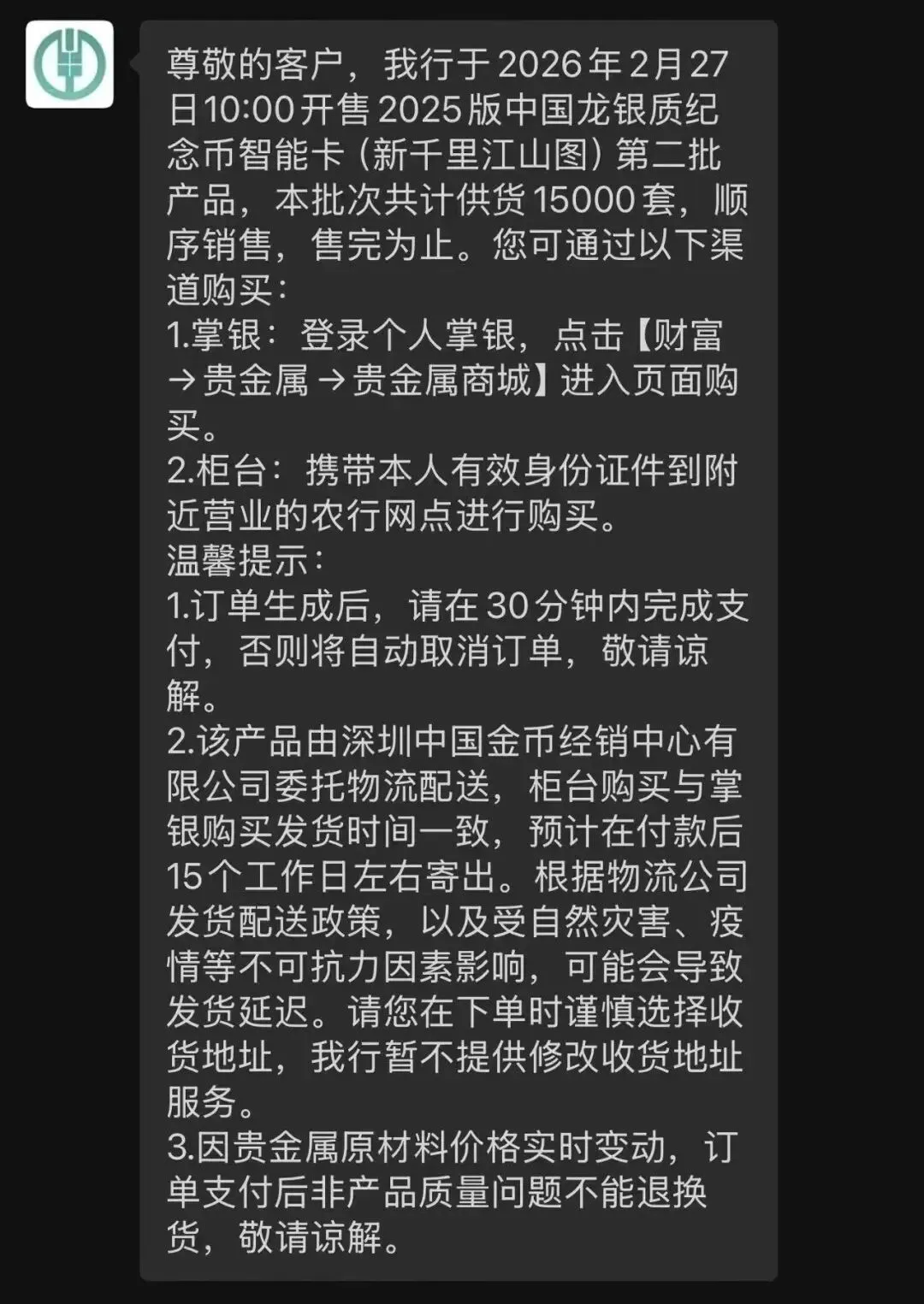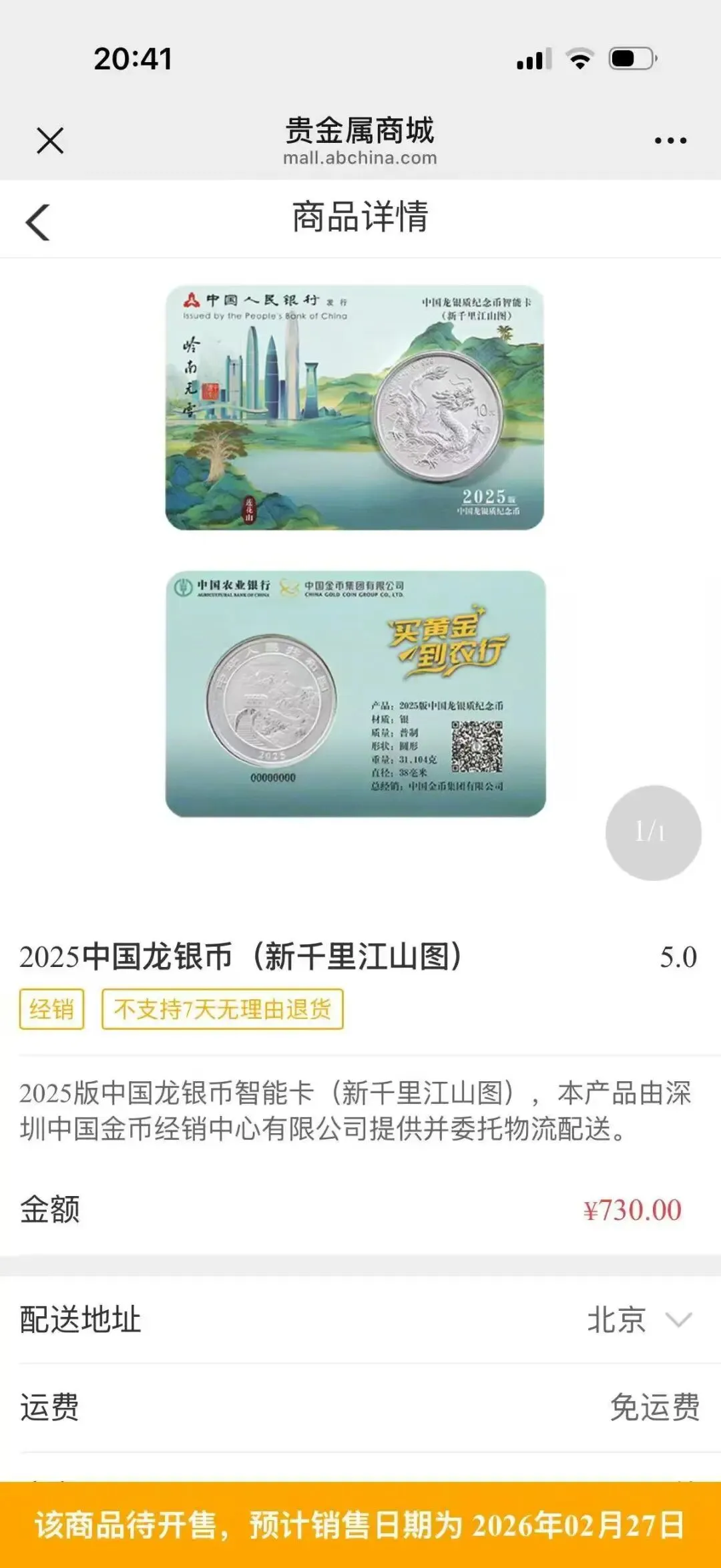 农行app搜"千里江山",购买2025中国龙银币(新千里江山图),具体操作:app→财富→贵金属→贵金属商城。