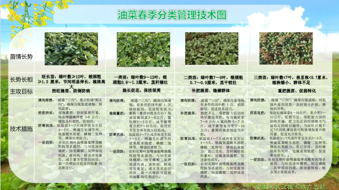 防冻害。密切防范抽薹、开花期“倒春寒”,在低温前 3~7天或冷害发生后 3~5 天,喷施生长调节剂、氨基酸水溶肥、磷酸二氢钾等,增强植株抗寒性或恢复能力。