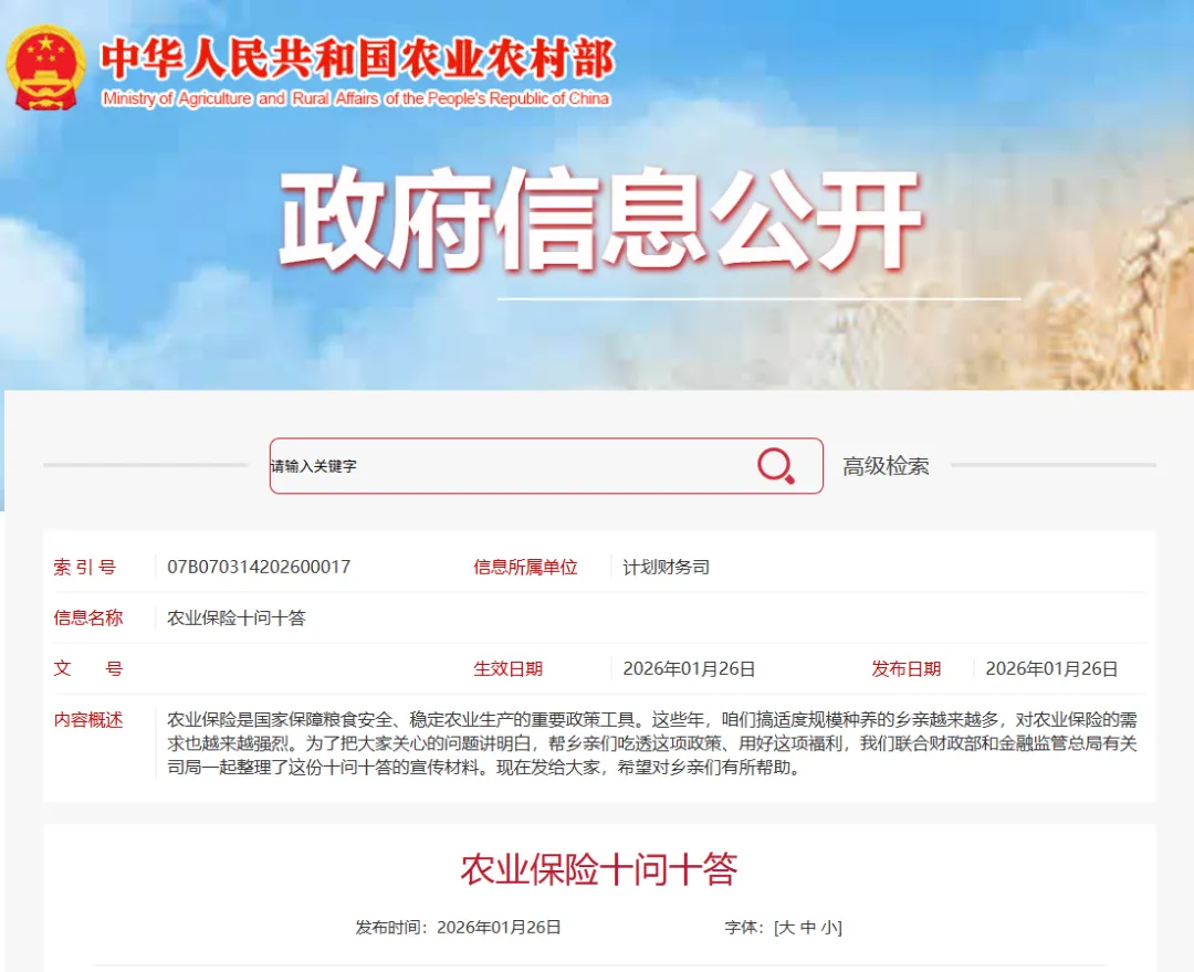 农业保险是国家保障粮食安全、稳定农业生产的重要政策工具。这些年,咱们搞适度规模种养的乡亲越来越多,对农业保险的需求也越来越强烈。为了把大家关心的问题讲明白,帮乡亲们吃透这项政策、用好这项福利,我们联合财政部和金融监管总局有关司局一起整理了这份十问十答的宣传材料。现在发给大家,希望对乡亲们有所帮助。