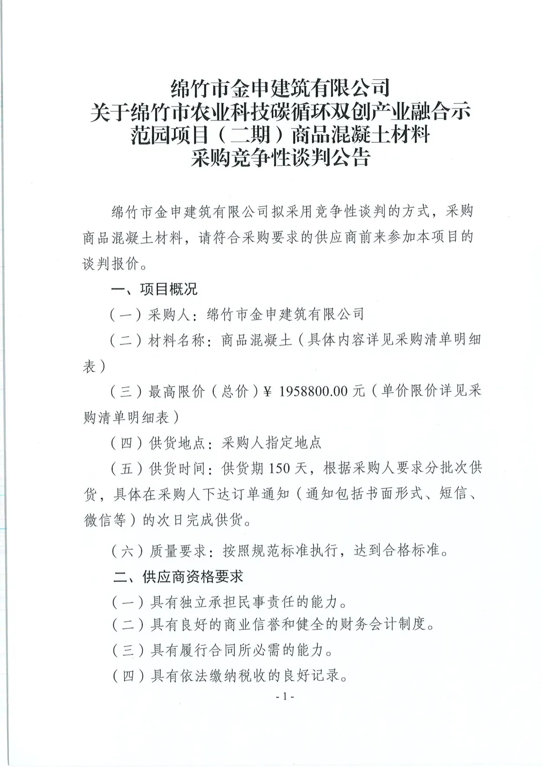 >绵竹市金申建筑有限公司关于绵竹市农业科技碳循环双创产业融合示范园项目(二期)商品混凝士材料采购竞争性谈判公告