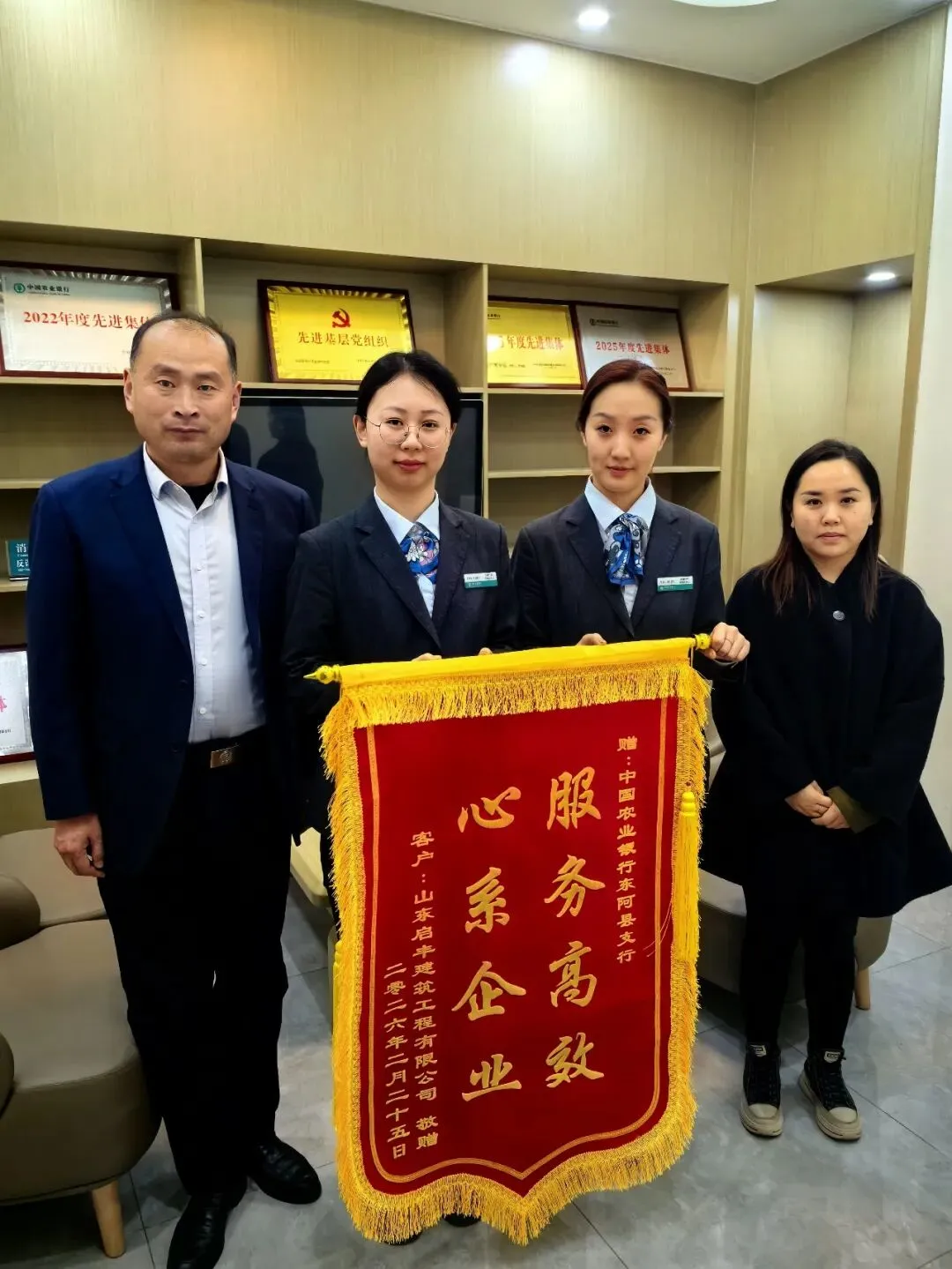 近日,一面写有“服务高效 心系企业”的锦旗送到了农业银行东阿县支行,客户对网点工作人员专业、高效的服务表示感谢。事情要从春节前最后一个工作日说起: