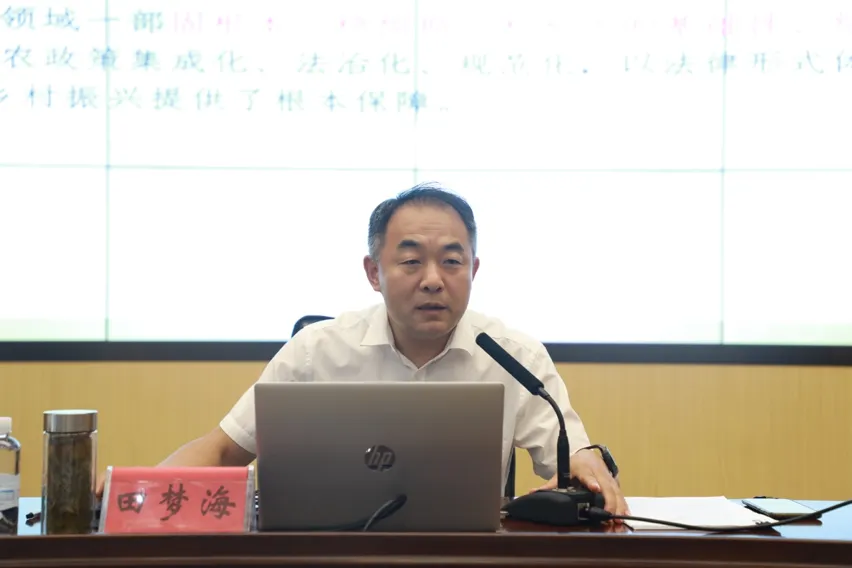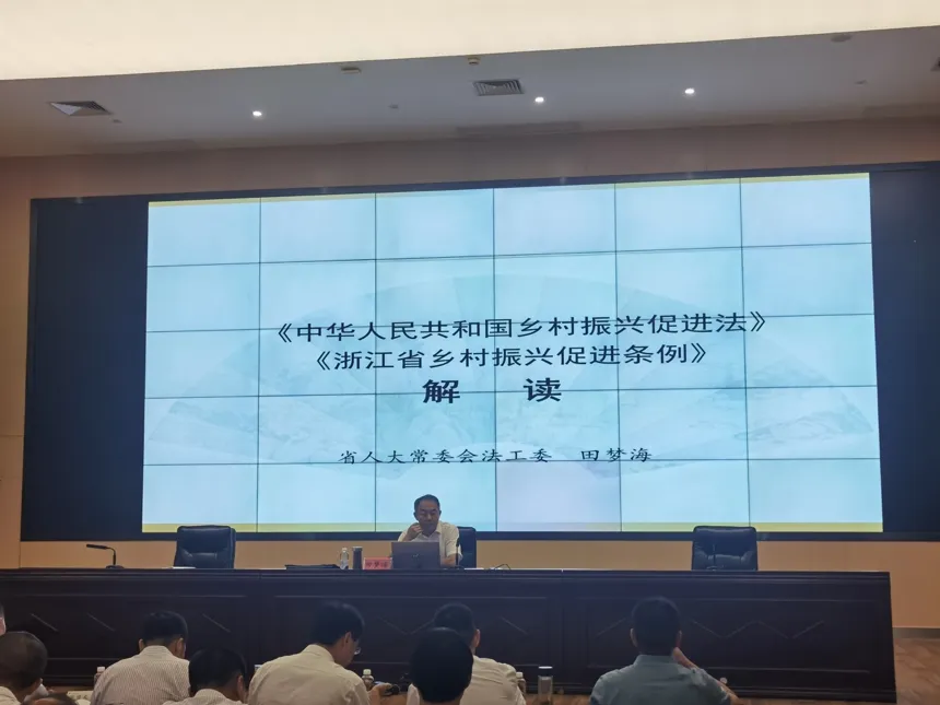 培训会上,田梦海就“一法一条例”的立法背景、主要内容和贯彻实施作了全面介绍和深入解读,他指出,《中华人民共和国乡村振兴促进法》是我国“三农”领域一部固根本、稳预期、利长远的基础性、综合性法律,与党中央一号文件、乡村振兴战略规划等共同构建了实施乡村振兴战略的“四梁八柱”,这部法律将我们党强农富农惠农政策集成化、法治化、规范化,以法律形式体现了党对三农工作的主张,为全面推进乡村振兴提供了根本保障。《乡村振兴促进法》出台后,《浙江省乡村振兴促进条例》与上位法有机衔接,对上位法中已有明确规定的内容不再赘述,重点围绕乡村振兴“五大振兴”内容来谋篇布局,巩固提升浙江乡村振兴标志性成果、将数字乡村、共同富裕、城乡融合提升到更加突出位置,努力做好“软法”也要有硬措施,为推动乡村振兴破难题、开新局、聚合力提供法治保障。