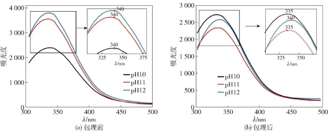 在设定的3种不同pH值(10、11、12)环境下,研究了不同pH值对包埋前后Cur的影响(图3)。蛋白质内在的荧光现象主要归因于某些疏水性氨基酸残基,特别是色氨酸和酪氨酸残基,它们是分析蛋白质结构特征时最为常用的荧光探针[18]。当蛋白质所处微观环境的极性状态发生改变时,固有的荧光光谱特性会相应地受到该环境极性变化的直接影响,这种影响既可能表现为最大荧光发射波长的位移,也可能导致蛋白质荧光的减弱乃至猝灭。