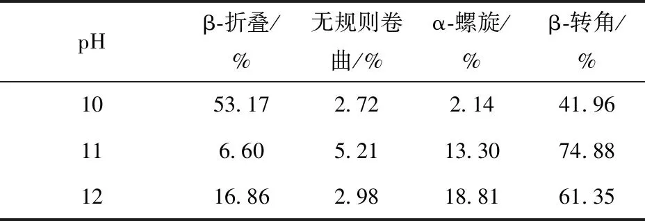 使用PeakFit 4.12软件对酰胺Ⅰ带(1 700~1 600 cm-1)进行基线校正、二阶导数和平滑,并结合曲线拟合计算WBPs-Cur中蛋白质的二级结构。WBPs-Cur蛋白红外光谱二级结构分析如表1。蛋白质以β-转角和β-折叠结构为主;β-转角和 β-折叠中含有较多的氢键,能形成较为有序、规则的结构。随着溶液pH值的不断增加,α-螺旋结构增加;α-螺旋结构通过主链间规则的氢键维持,其含量增加表明复合物内部结构更加稳定,尤其在pH值变化时,复合物抗变性能更强。制备过程中,pH诱导处理破坏了蛋白质分子之间的氢键,导致α-螺旋、β-转角和β-折叠结构显著变化,这说明不同pH处理WBPs-Cur的过程中,蛋白质的二级结构发生了变化,也表明Cur还可通过氢键和静电相互作用被包裹于递送体系内部。