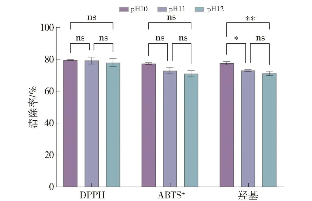 不同pH值时WBPs-Cur纳米复合物的抗氧化活性见图5。由图5可知,在溶液pH值为10、11、12时,WBPs-Cur纳米复合物(2 mg/mL)的DPPH自由基清除能力分别为(79.95±0.36)%、(79.68±2.18)%和(78.31±2.58)%。相同条件下,DPPH自由基清除能力随pH值的增加而降低,但变化不大。当pH值增大时游离Cur增加,由于缺乏屏障保护,导致保留率低,因此清除DPPH自由基的能力大大降低。相应地,Cur包埋后清除DPPH自由基的能力增强[22]。DPPH自由基清除能力与不同pH值下Cur包埋率成正比。Cur分子中的酚羟基和亚甲基提供的H+使ABTS+自由基清除率较高[22]。通过测定添加抗氧化剂后ABTS+自由基溶液在734 nm处吸光度的变化,可以有效评估复合物与ABTS+自由基之间相互作用的强度[23]。由图5可知,溶液pH值为10时,ABTS+自由基清除率为(77.81±2.14)%。随着pH值的增加,ABTS+自由基清除率逐渐降低,这可能是因为Cur虽然被包埋,但当ABTS+自由基存在时,Cur仍能发挥自由基清除作用[22]。图5显示了WBPs-Cur在设定的pH值范围内,复合物的羟自由基清除率随着pH值的增加而减小,这可能与羟自由基清除率受酸性氨基酸侧链中羟基和氨基的影响有关[24]。当溶液pH值为10时,羟自由基清除率为(78.00±4.39)%。核桃肽中氨基酸组成主要为谷氨酸,且谷氨酸为酸性氨基酸,当pH值逐渐增大时,谷氨酸中的羟基和氨基解离,使得羟自由基清除率降低。