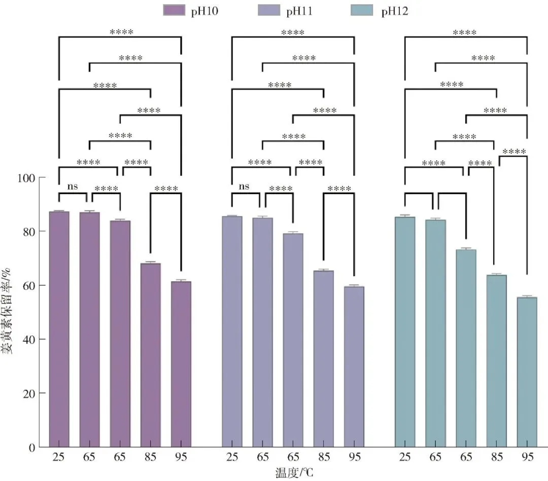 Cur分子表现出高度的化学不稳定性,高温会促进其降解[5] 。仅30 min的温水储存即可导致Cur结构显著降解,损耗比例可高达90%[25],但通过包埋技术可以有效提高Cur的稳定性。任杰等[26]测定了游离Cur在不同温度下加热30 min后的保留率,结果表明,游离Cur在温度为75、85 ℃时的保留率均低于60%, 95 ℃时的保留率低于50%。WBPs-Cur纳米复合物在65、75、85、95 ℃的热稳定性如图6。由图6可知,不同温度加热30 min后,Cur保留率随温度升高而降低,温度升高加速了Cur的降解, 65 ℃时Cur保留率较高。65、75、85 ℃时,Cur保留率均在60%以上; 95 ℃时,Cur保留率在55%以上。这可能归因于,Cur在疏水环境中的降解速度低于亲水环境[5],而Cur被包埋于WBPs后,处于更疏水的环境中,且WBPs的活性基团可通过疏水相互作用在制备的纳米复合物中发挥一定的保护作用,因此,包埋于WBPs中的Cur具有较高的热稳定性。在不同温度条件下,随着pH值的增加,Cur保留率呈降低趋势。由图1可知,pH值的增加会导致 WBPs 对Cur的包埋率下降;当pH值增大时,游离Cur由于缺乏屏障保护,导致其保留率降低。在热处理条件下,WBPs可以有效地保护其所包裹的Cur,提高WBPs-Cur纳米复合物的热稳定性。