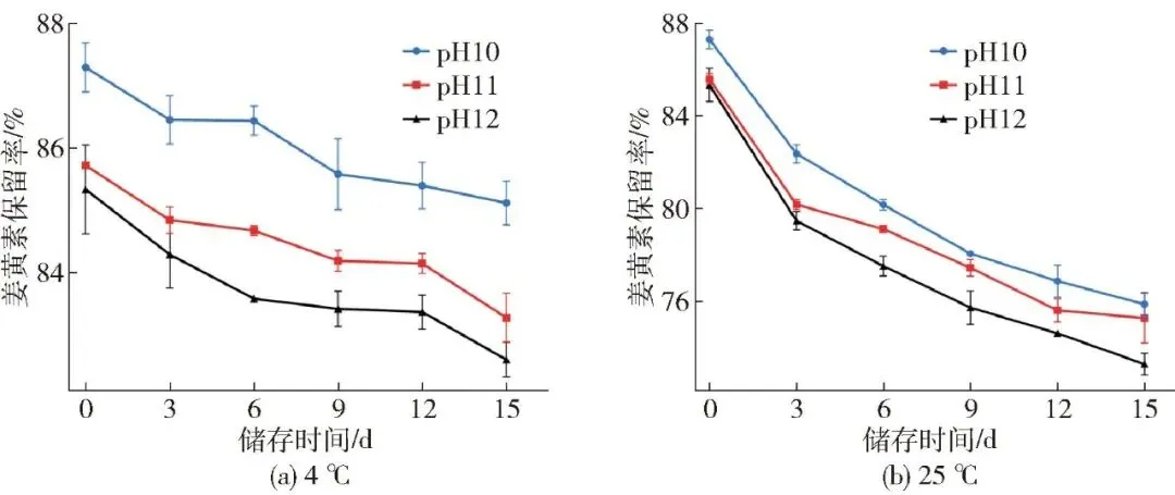 WBPs-Cur纳米复合物的储藏稳定性至关重要,直接影响其功能活性、生物利用度及实际应用价值。WBPs-Cur纳米复合物的储藏稳定性见图7。刘晗[27]将游离Cur在溶液pH值为9,室温条件下处理6 h后,Cur被大量降解,只有15%的保留率。研究表明,随着温度的升高Cur的稳定性降低;且碱性条件下,pH值越大Cur的稳定性越低。由图7可知,4、25 ℃环境下分别储存15 d时,Cur的保留率逐渐降低,但降低的幅度较小;储存15 d后Cur保留率依旧较高,均在70%以上。Cur保留率逐渐降低,可能是由于储存期间的酶解作用和氧化损伤破坏了WBPs外壳,使Cur泄漏;而Cur保留率依旧较游离态高,可能是因为包埋后的Cur在水溶液中对化学降解具有一定的抗性[21]。25 ℃时Cur的保留率随时间延长而下降的幅度比4 ℃时大;这可能主要是因为储存温度的升高加速了酶解作用和氧化损伤。此外,随着pH值的增大,4、25 ℃时Cur保留率均呈降低趋势;这可能是因为随着pH值的增大, WBPs的解离和重组行为受到影响,Cur包埋率降低,进而导致Cur保留率呈降低趋势。